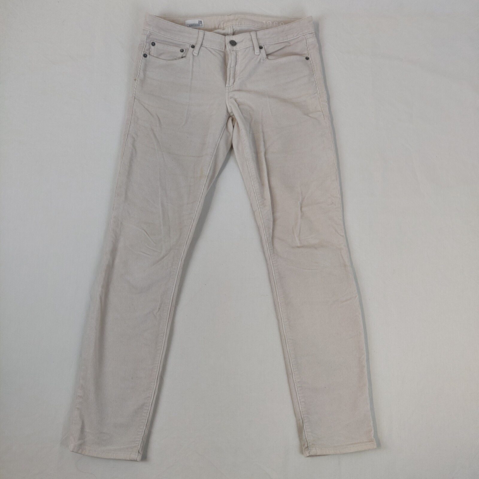 Autres commentaires : 16% polyester, 1% élasthanne. Pantalon en velours côtelé beige (taille 28). Coupe Skinny. 2 poches latérales et 2 poches arrières. Passants pour une ceinture. Quelques tâches discrètes en dessous de la poche avant droite et tâches oranges au niveau de la jambe droite. Niveau réduit de fraise à myrtille.