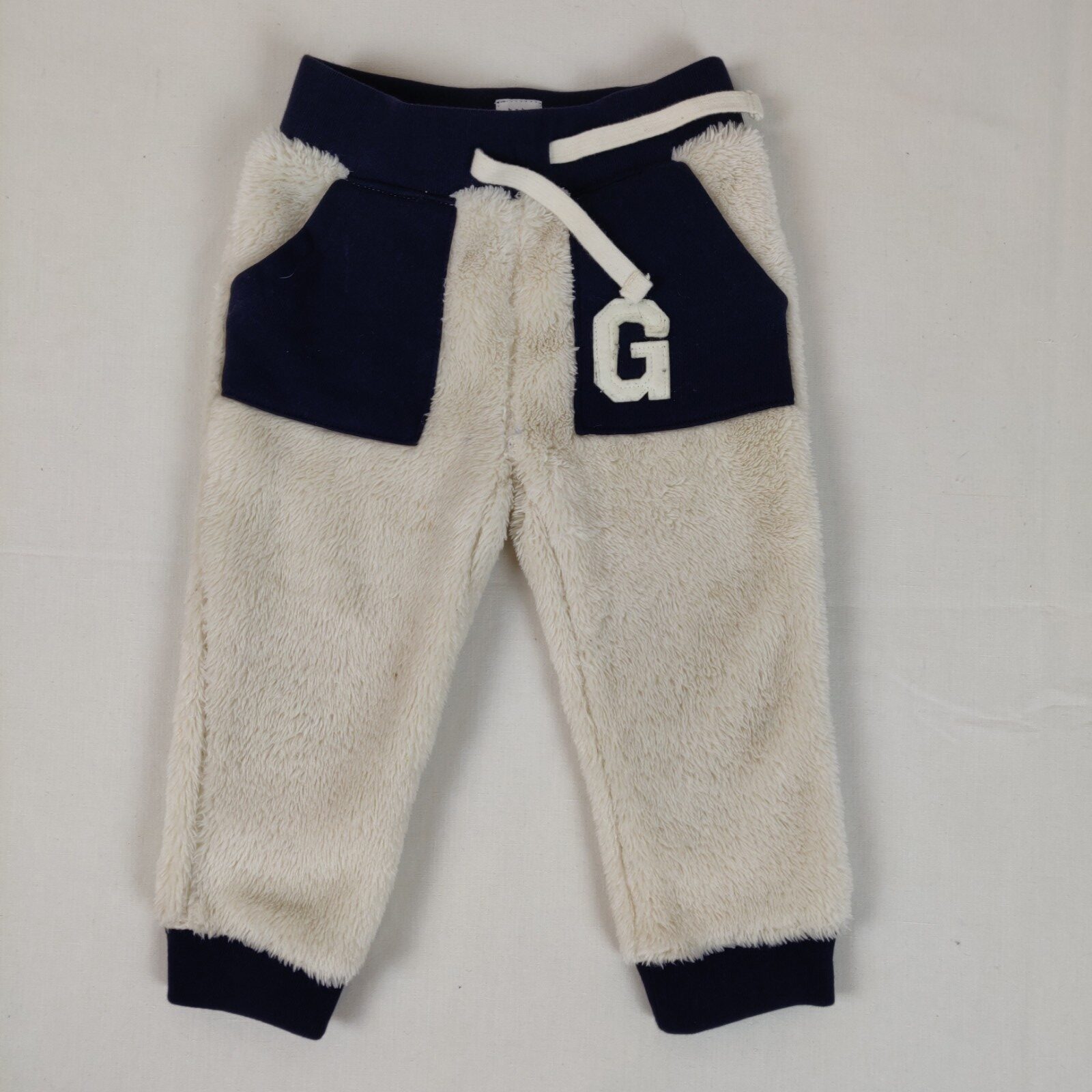 Autres commentaires : Pantalon en fourrure synthétique – écru avec les poches latérales et les chevilles bleu marine. Lettre G piquée apposée sur la poche gauche. Taille élatique avec cordon blanc. Petitet tâche d’encre bleue au niveau de la couture avant. Niveau réduit de fraise à myrtille.