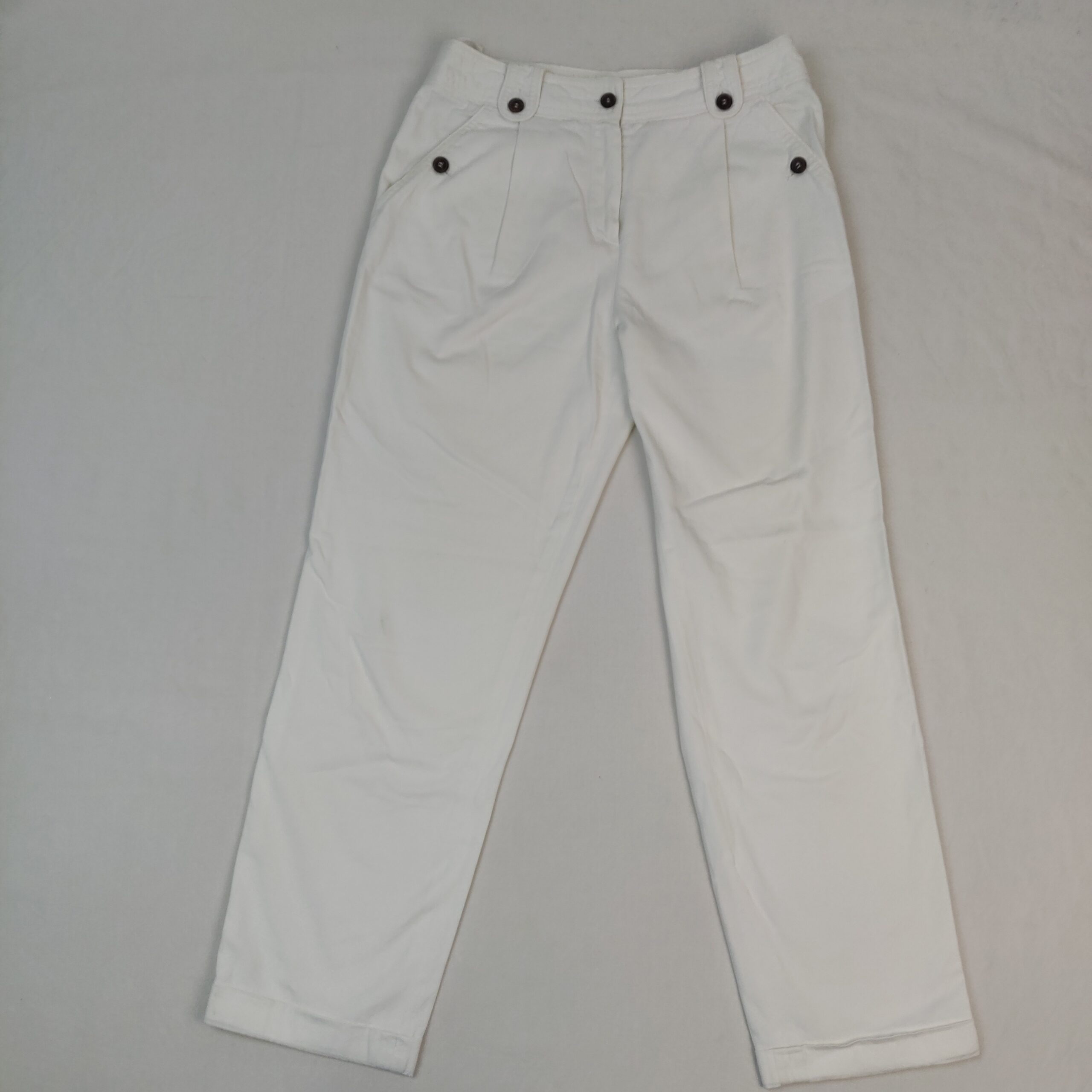Autres commentaires : 2% élasthanne, Pantalon blanc cassé à pinces large, revers au niveau des chevilles, fermeture par boutons et zip. Taille 36