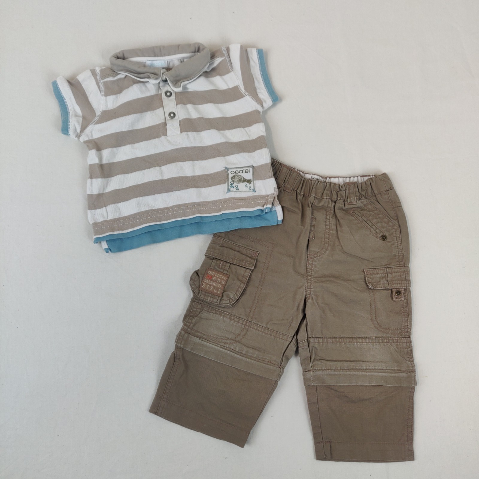 Autres commentaires : Pantalon – marron clair. Taille élastique. Bas du pantalon désolidarisable à l’aide d’un zip. 2 poches latérales à rabat et 2 poches arrières. Passants pour une ceinture. Polo à manches courtes Obaïbi blanc rayé marron offert. Une tâche centrale discrète.