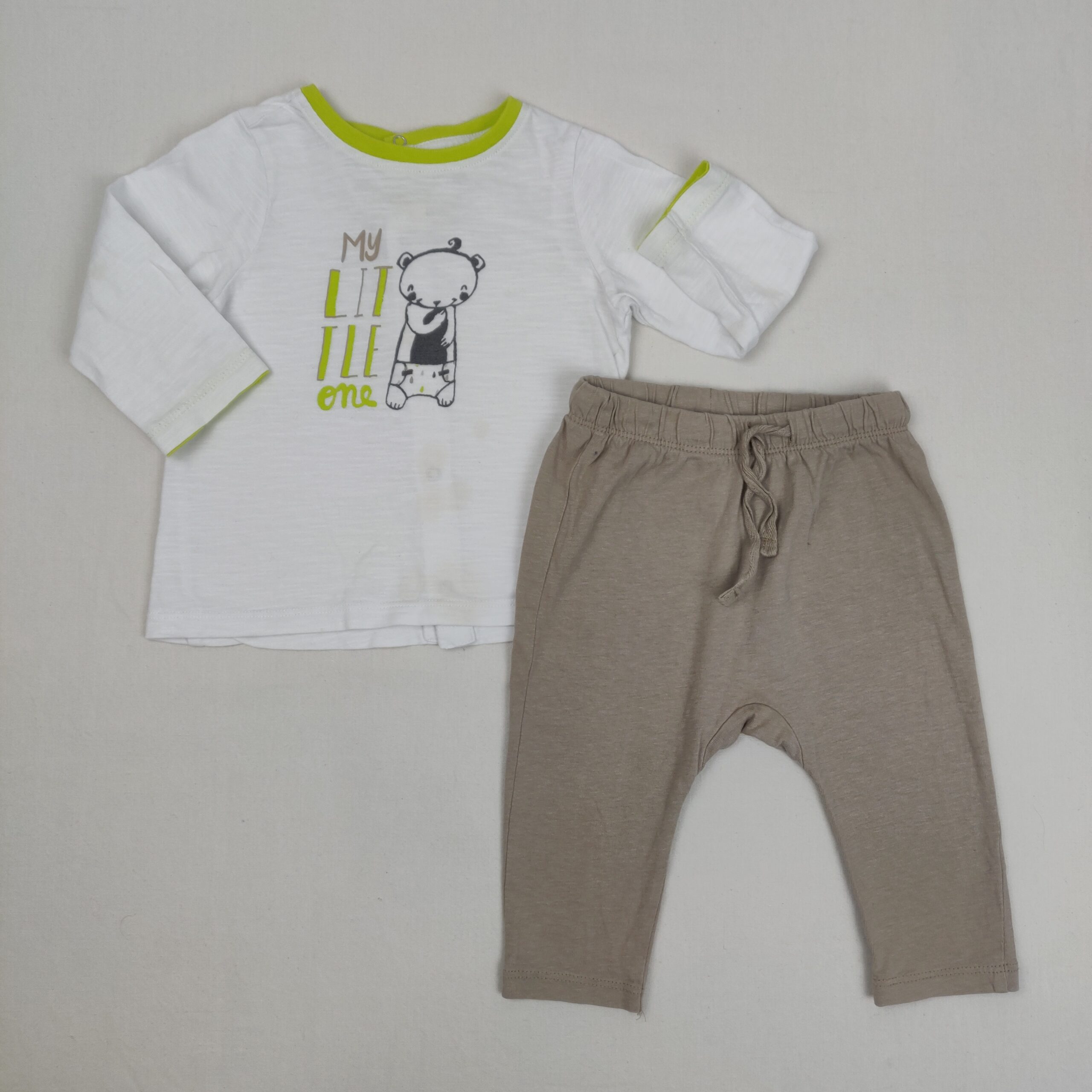 Autres commentaires : Pantalon en jersey beige, ceinture élastiquée avec lien, T-shirt manches longues OFFERT, col rond, motif « MY LITTLE ONE », fermeture par boutons pression au dos.