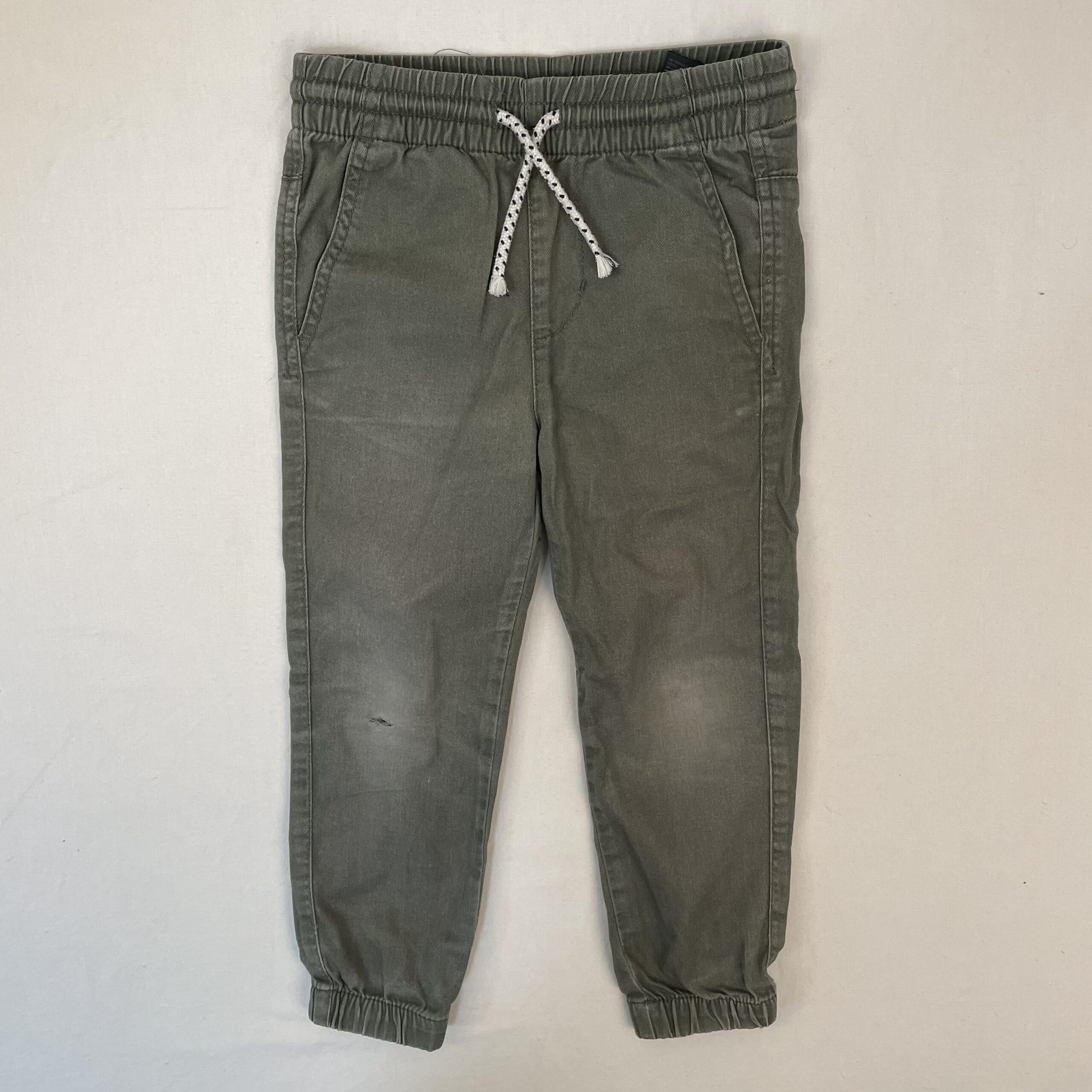 - Pantalon en toile kaki, chevilles élastiquées et taille avec cordons, élastiquée.