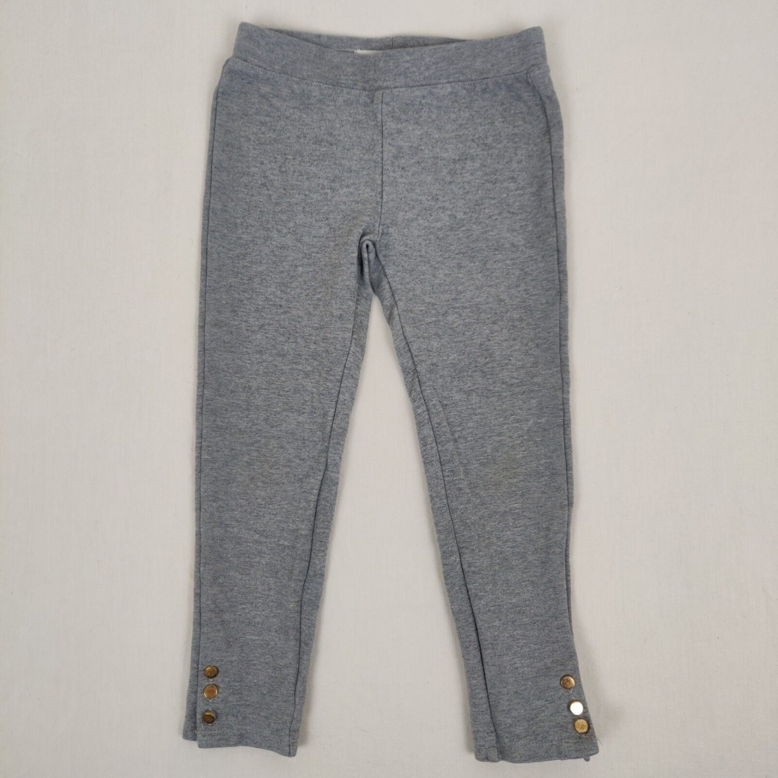 Autres commentaires : Coton biologique, 12% polyester, 4% élasthanne. Pantalon gris, taille élastiquée, 3 boutons dorés ferment les chevilles. Boutons légèrement décolorés.