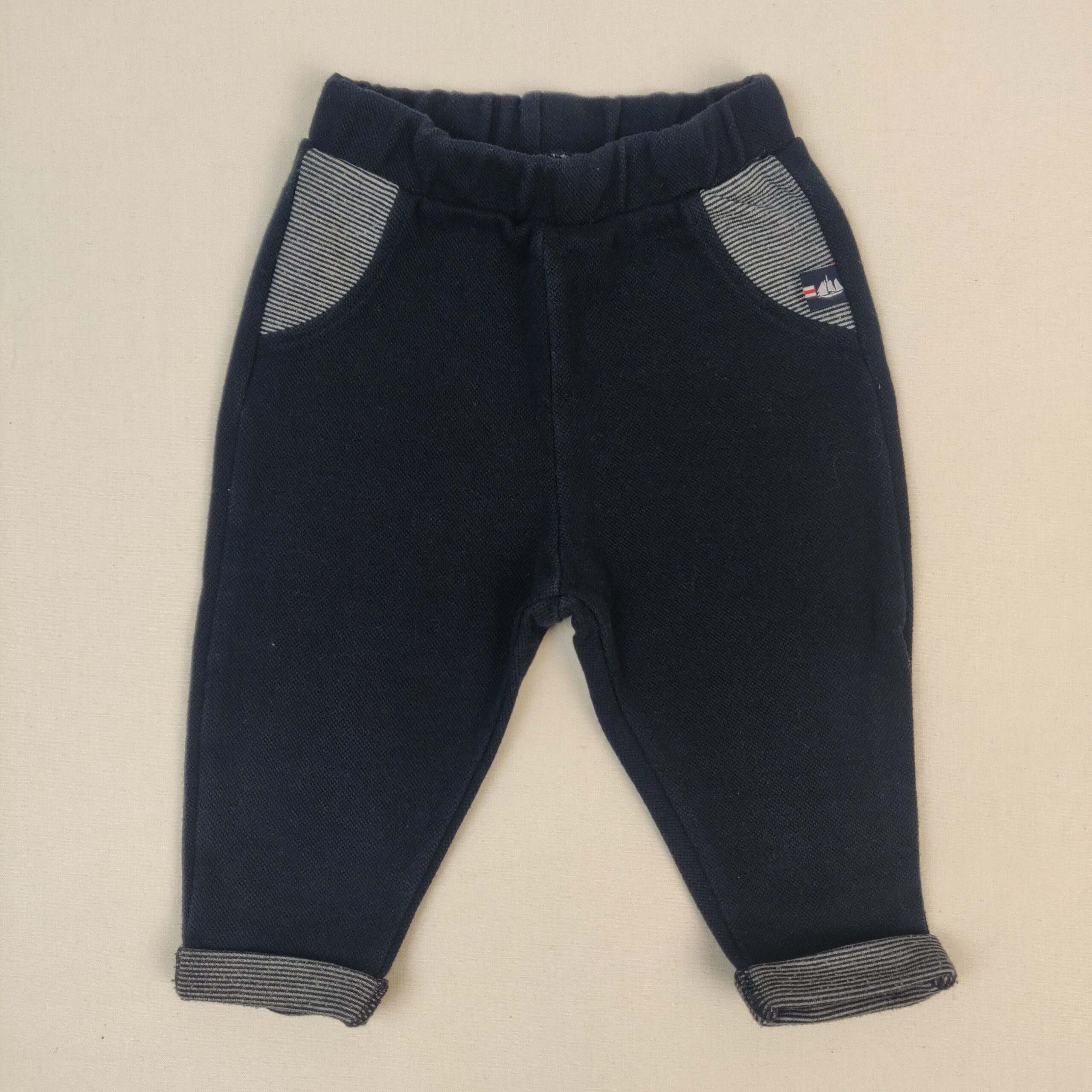Autres commentaires : 28% polyester. Pantalon sportswear bleu marine, revers rayés au niveau des chevilles et des poches; taille élastique.