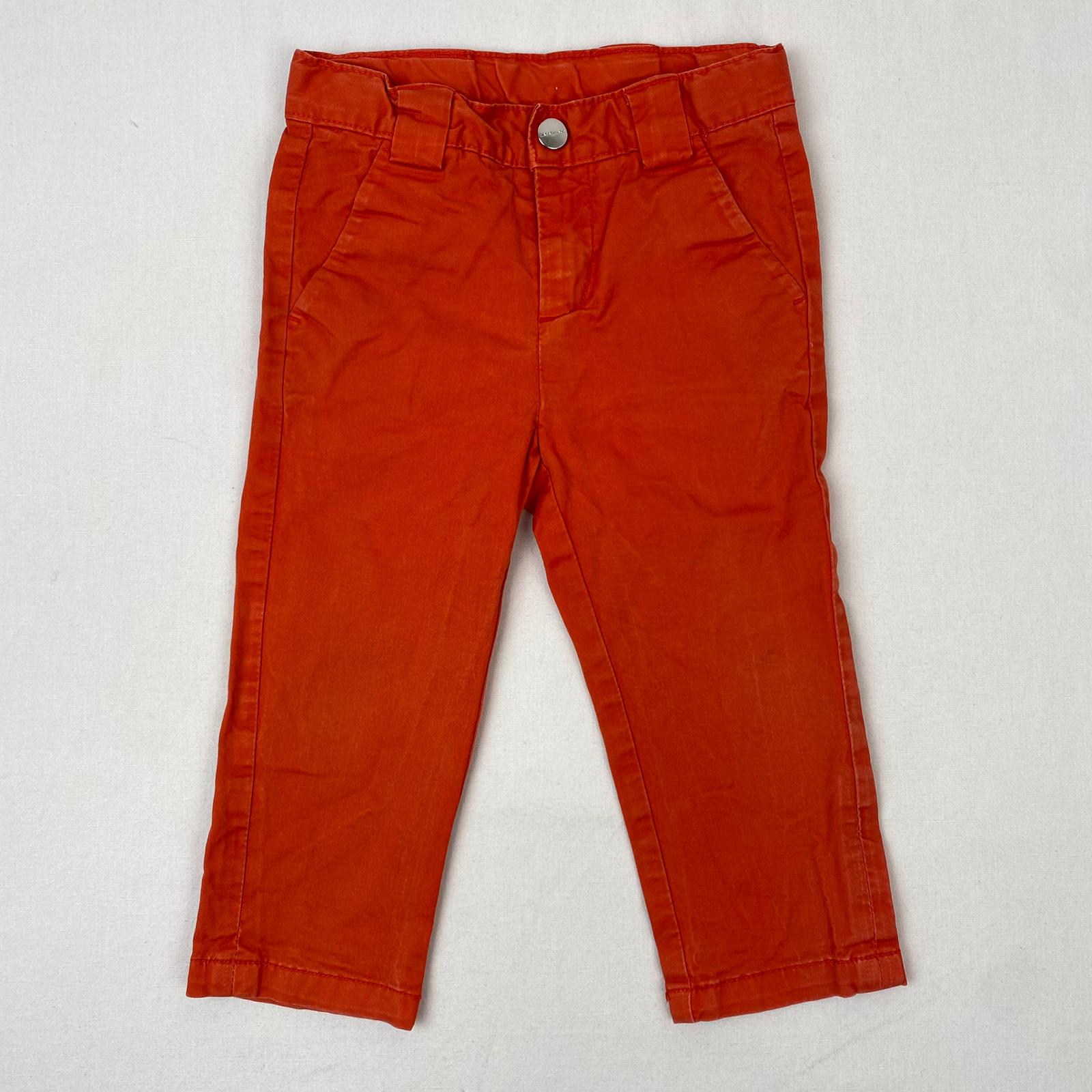 Autres commentaires : 2% elasthanne. Un pantalon orange, fermeture par boutons et zip, taille ajustable par élastique intérieur, avec 3 poches 2 devant et une derrière et un point noir au genoux discret.