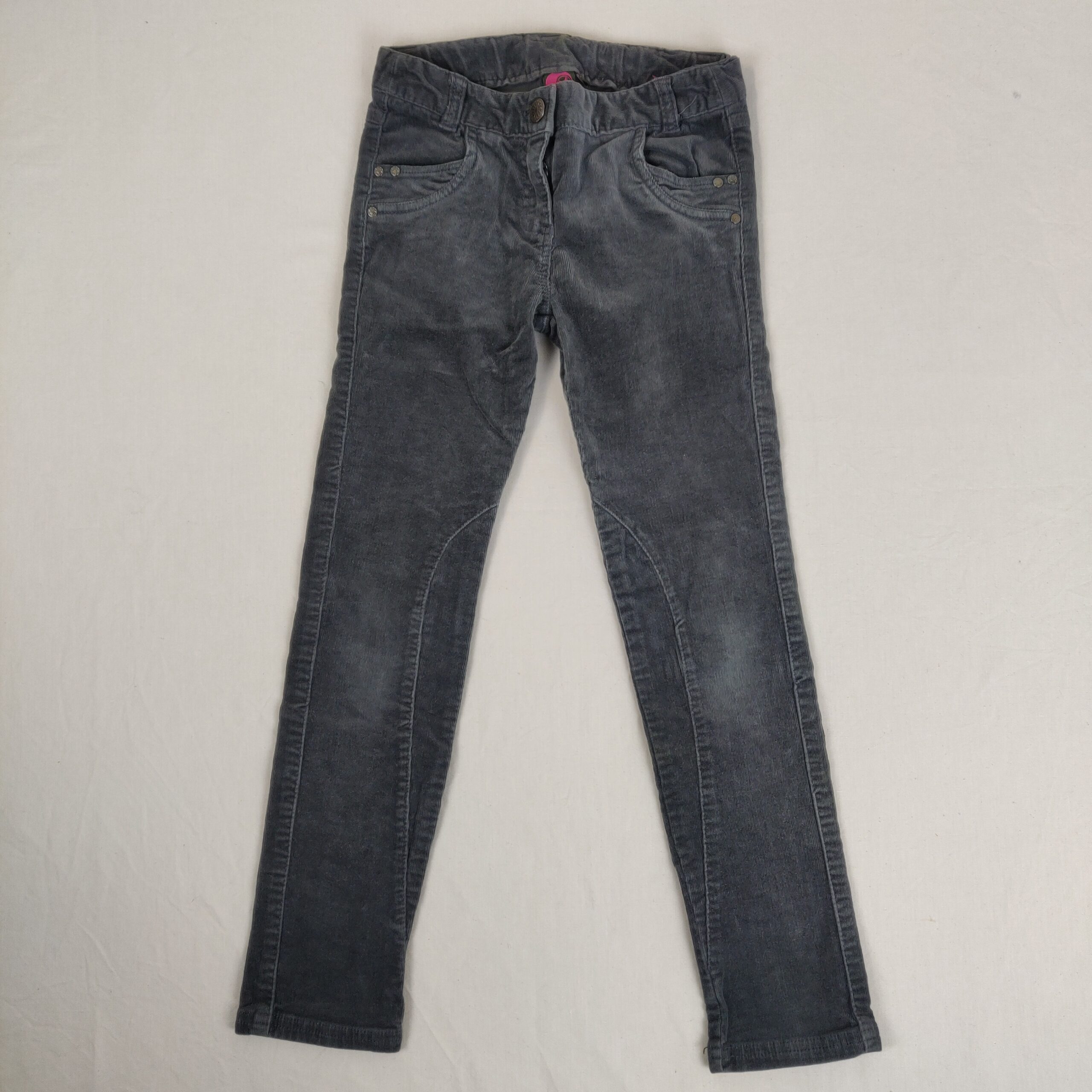 Autres commentaires : Pantalon en velours finement côtelé – gris. Taille ajustable. 2 poches latérales et 2 poches arrières. Marques d’usure au niveau des jambes.
