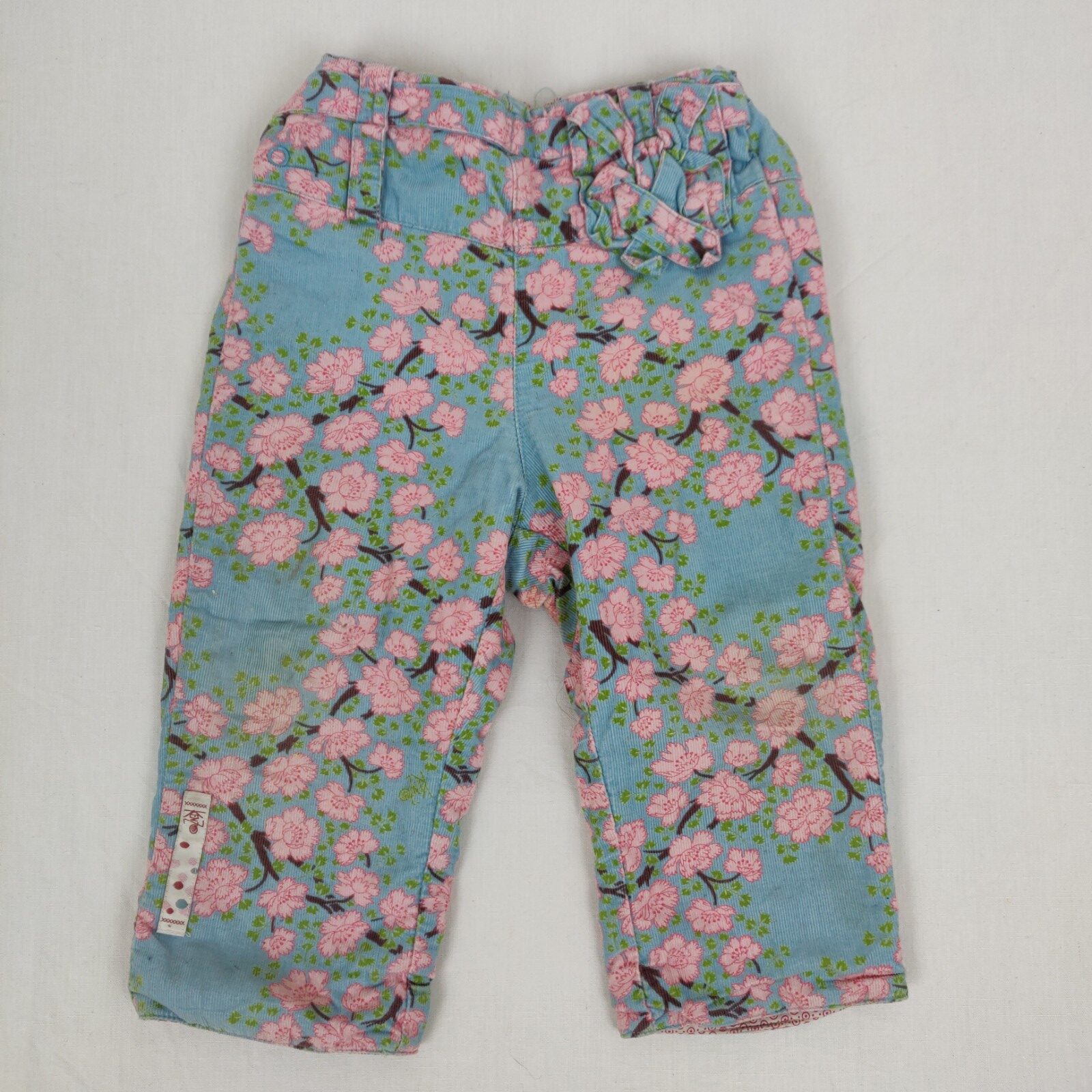 Autres commentaires : Coton : Extérieur velours et doublure en jersey – Garnissage en polyester. Pantalon d’hiver doublé et moletonné. Ceinture haute, arrière élastiqué. Fermetures latérales par deux boutons pression. Le bouton haut du côté gauche est un peu lâche. Motif fleurs de cerisier sur fond bleu.