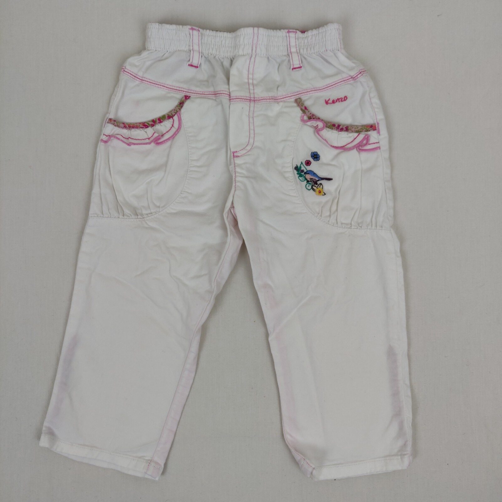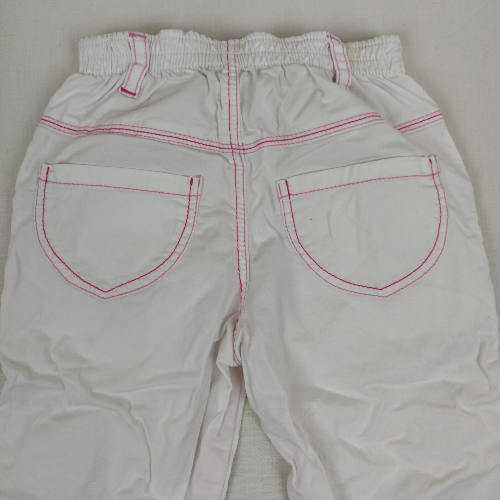 Autres commentaires : Pantalon blanc avec taille élastiquée et ceinturée, 2 poches latérales et 2 poches à l’arrière. Petit défaut: petite tâche marron sur la taille. Niveau reduit de Melon à Banane.