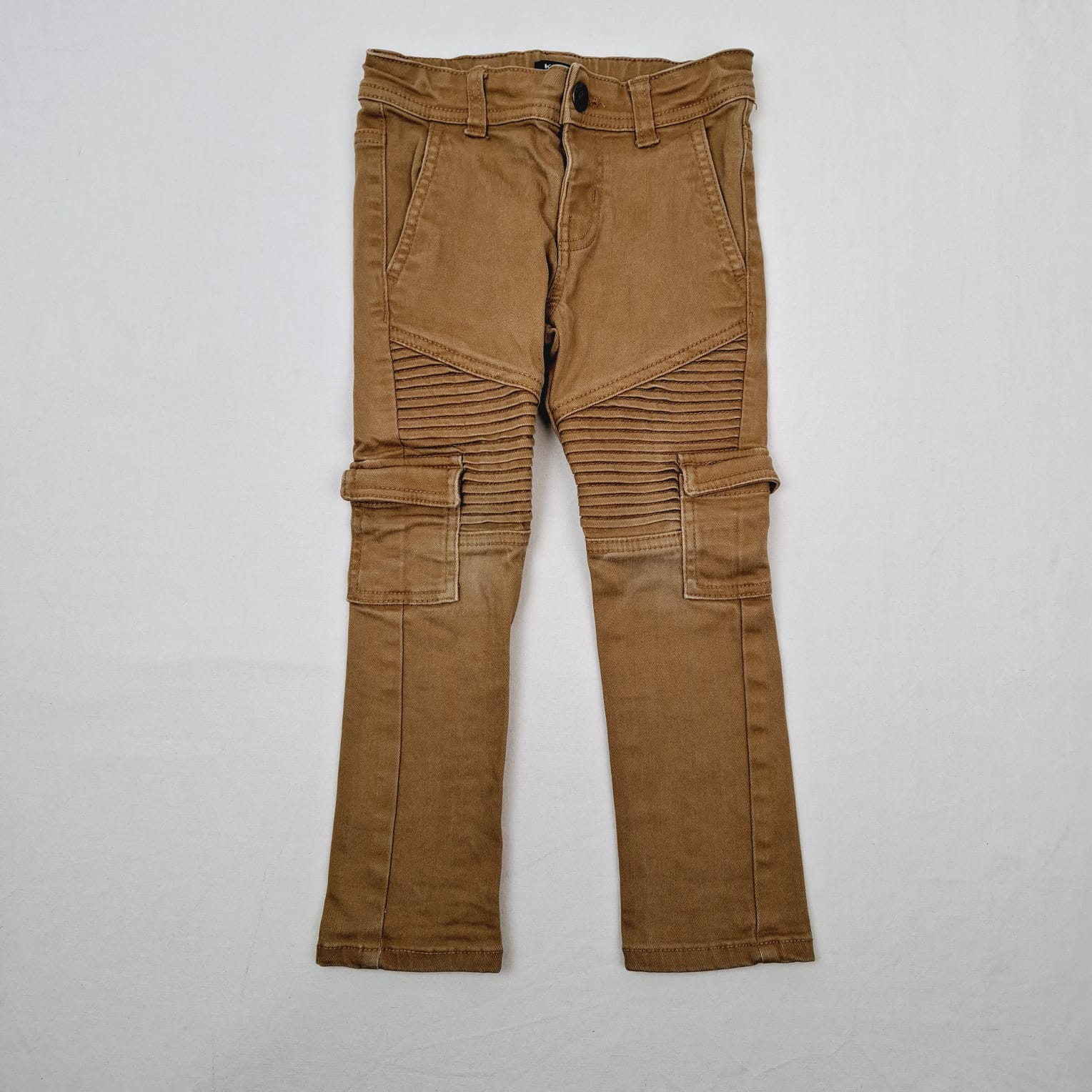 Autres commentaires : Pantalon marron, avec bouton pression et poche au niveau du genoux, ceinture ajustable par élastique intérieur. Taille estimée 5A.