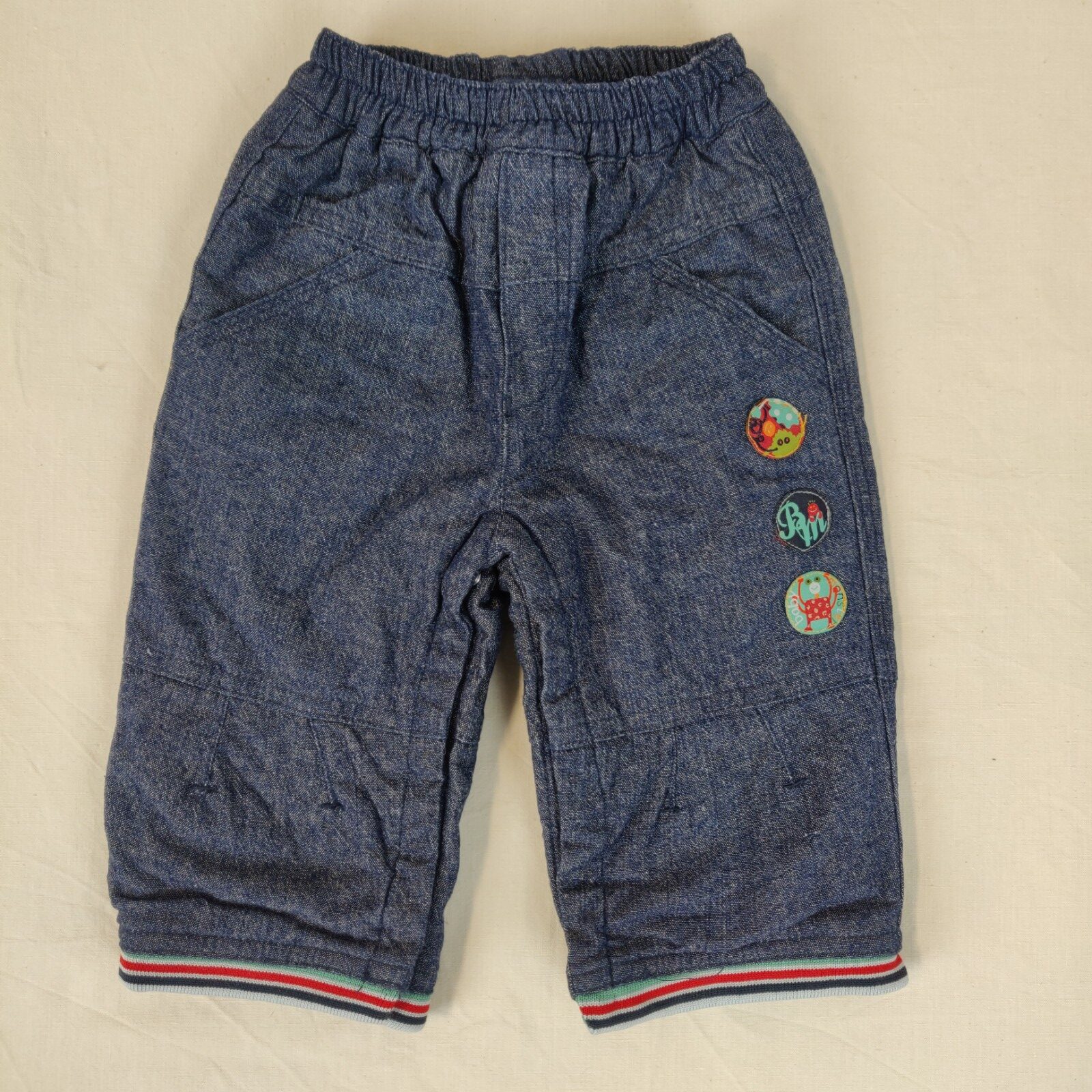 Autres commentaires : Pantalon doublé – bleu chiné avec 3 écussons multicolores au niveau de la jambe gauche. Taille élastique. 2 poches latérales et 2 poches arrières. Chevilles façon tricot élastique vert, rouge, bleu et bleu marine.