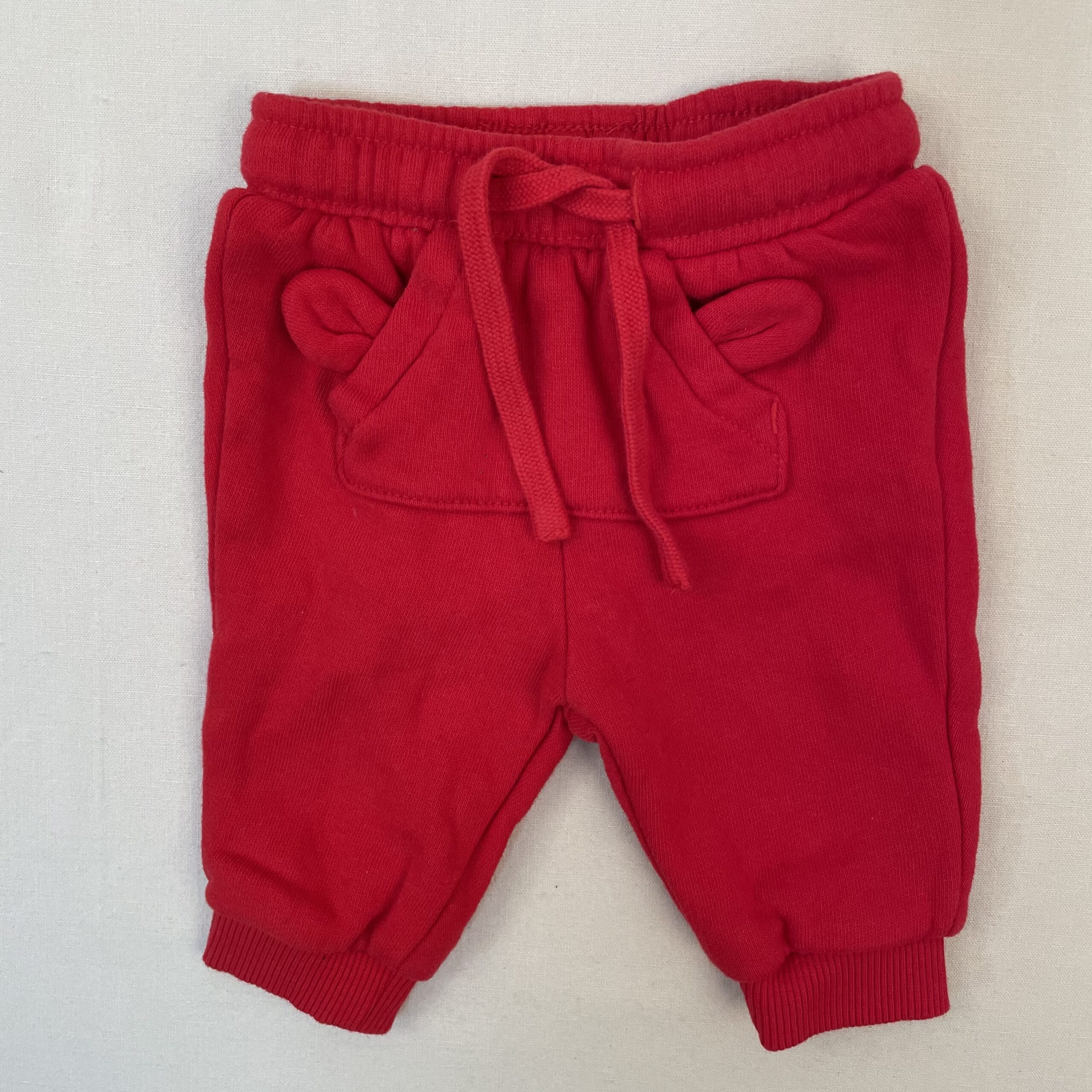 - Pantalon sportswear rouge, poche centrale à ouverture double avec petites oreilles en relief, intérieur un peu molletonné, taille élastiquée avec cordons de serrage. Taille 1M requalifiée en taille naissance.