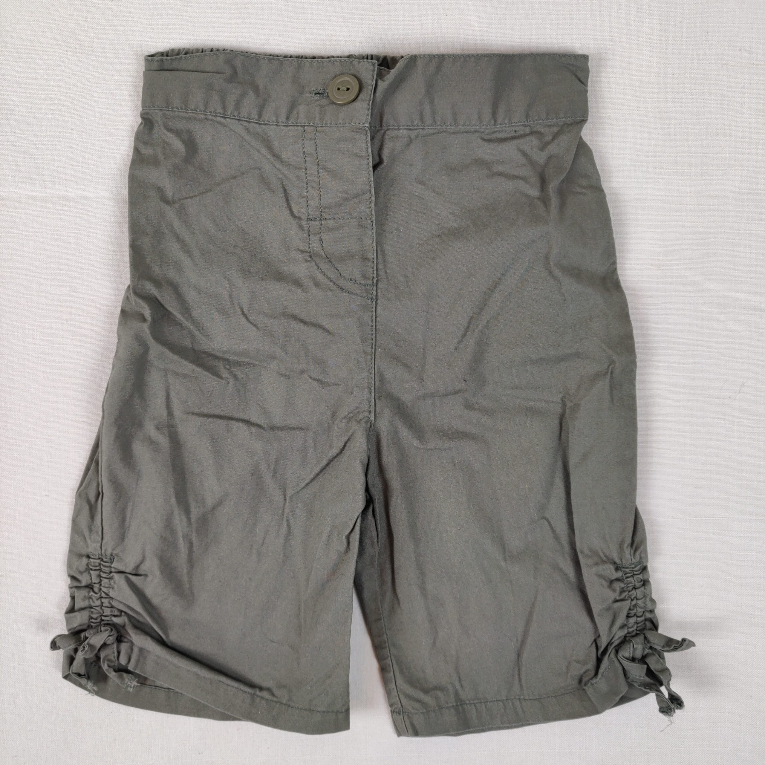 Autres commentaires : Bermuda kaki froncé aux genoux, fermé par bouton, taille élastique.