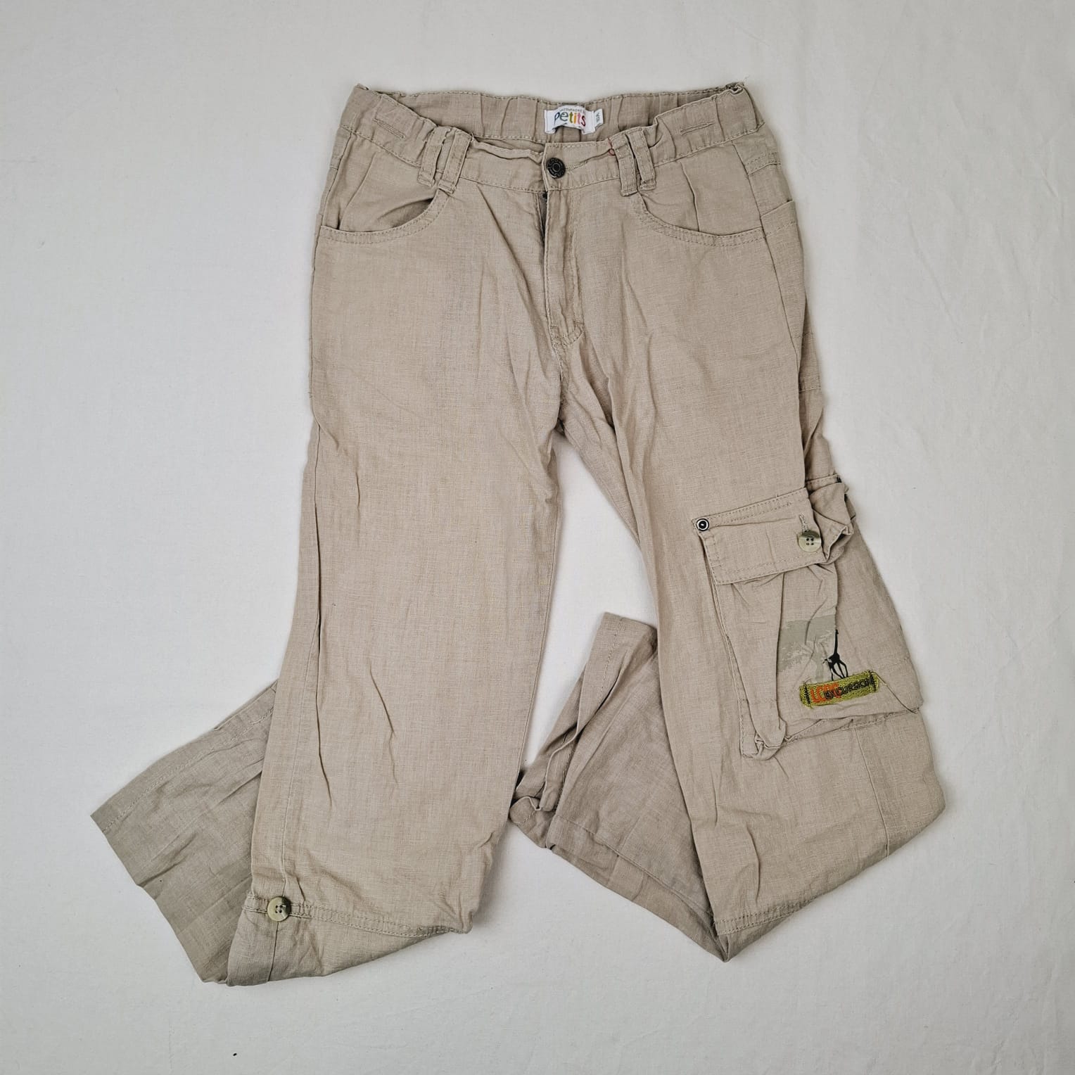 Autres commentaires : Coton 45%. Pantalon léger couleur sable avec grande poche latérale gauche avec motif de silhouettte kaki d’une girafe et l’inscription « LCDG excursion », étiquette d’expédition kaki cousue sur la poche arrière droite avec inscription « LCDG » brodée en orange, fermeture devant par zip et bouton, taille ajustable par élastique intérieur, retroussable en bas par boutons latéraux et pattes intérieures.