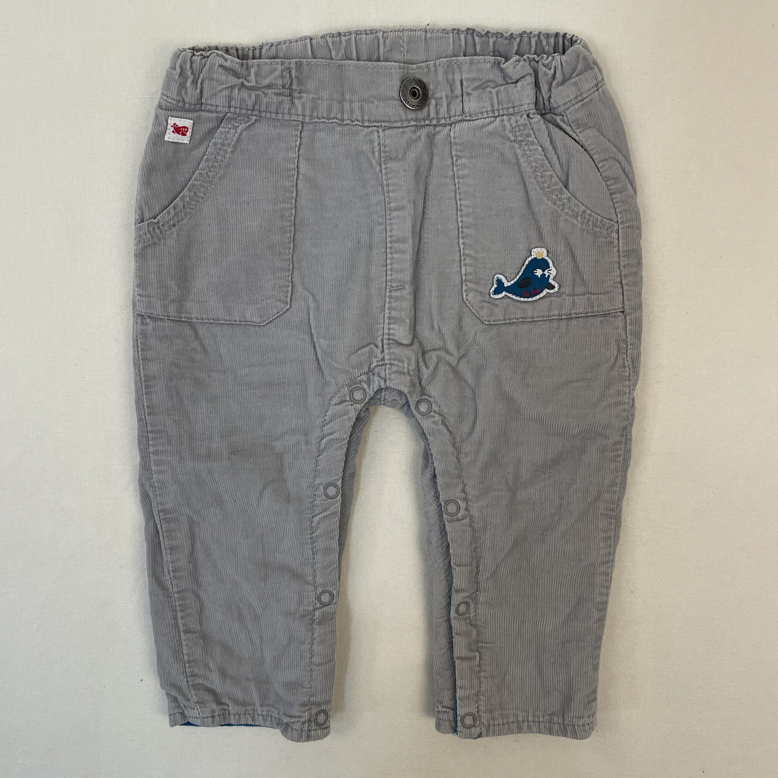 - Pantalon en velours finement côtelé gris clair, ceinture ajustable par élastique intérieur, devant bouton décoratif, devant motif cousu de petit phoque de couleur bleu canard, doublure bleu canard en 100% coton, fermeture à l’entrejambe par boutons pression.