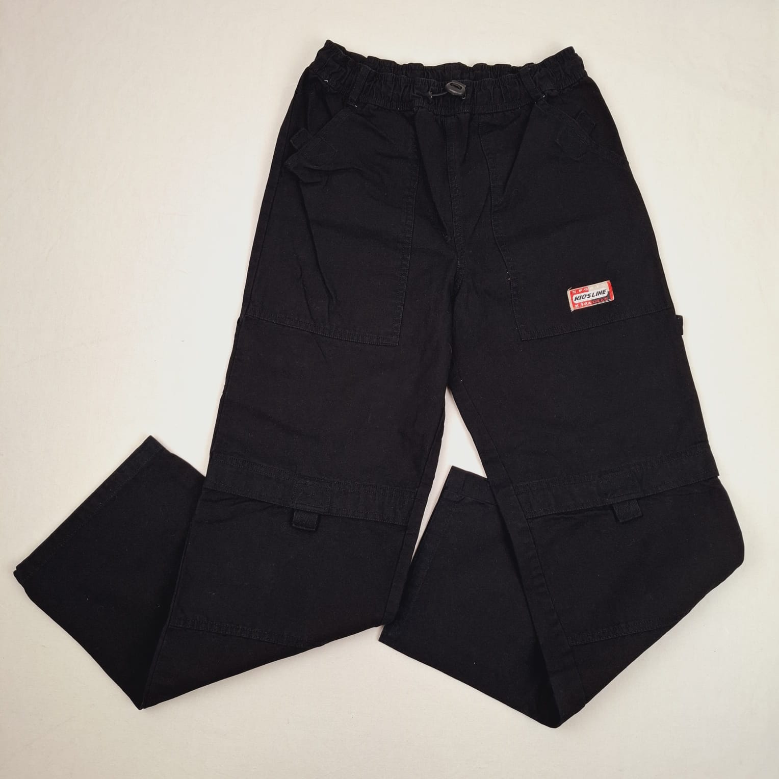 Autres commentaires : Pantalon en toile noir, taille réglable par cordon élastiqué avec un système de serrage, multi-poches.