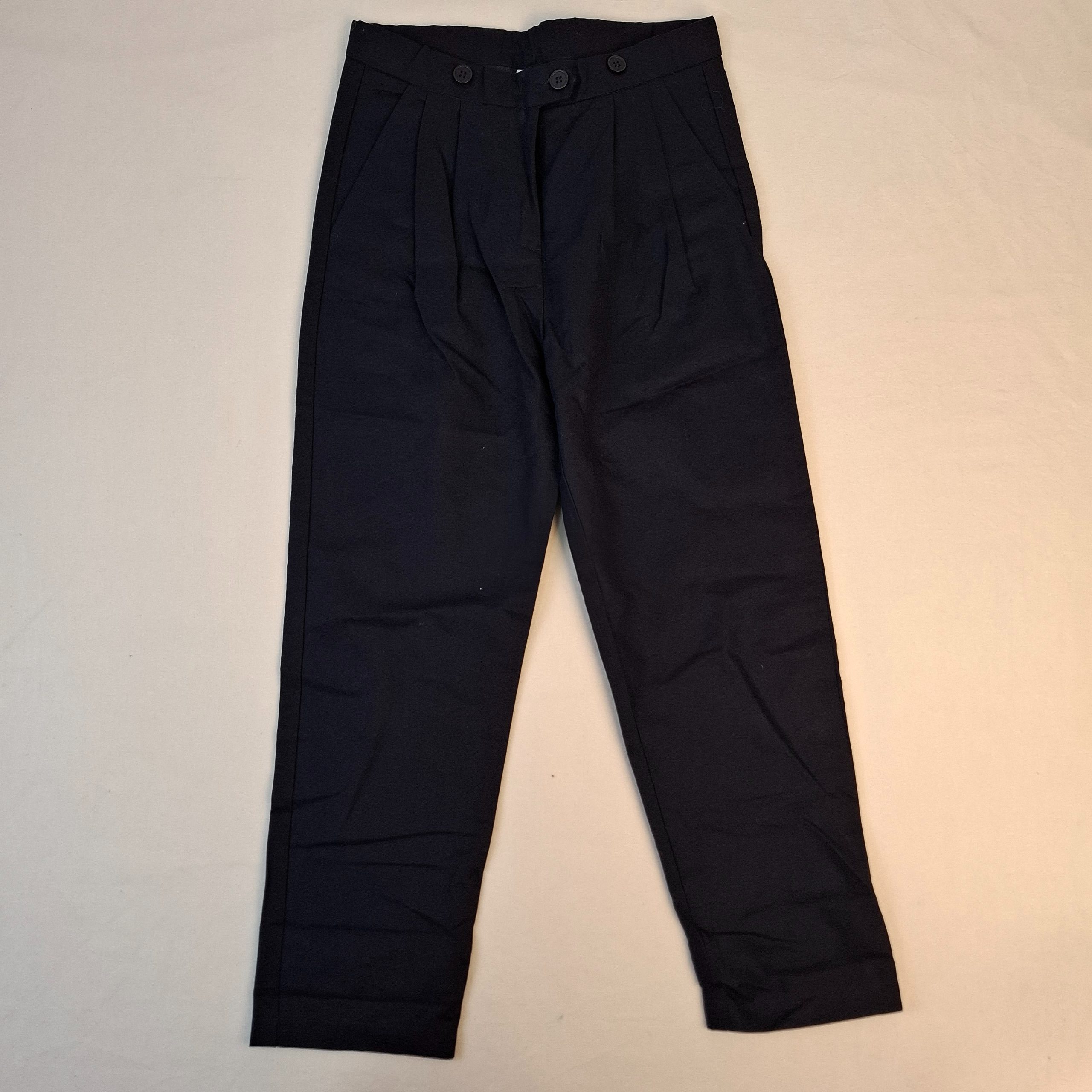- Pantalon à pinces chic bleu marine, ceinture ajustable par élastique intérieur, fermeture devant par zip et bouton.