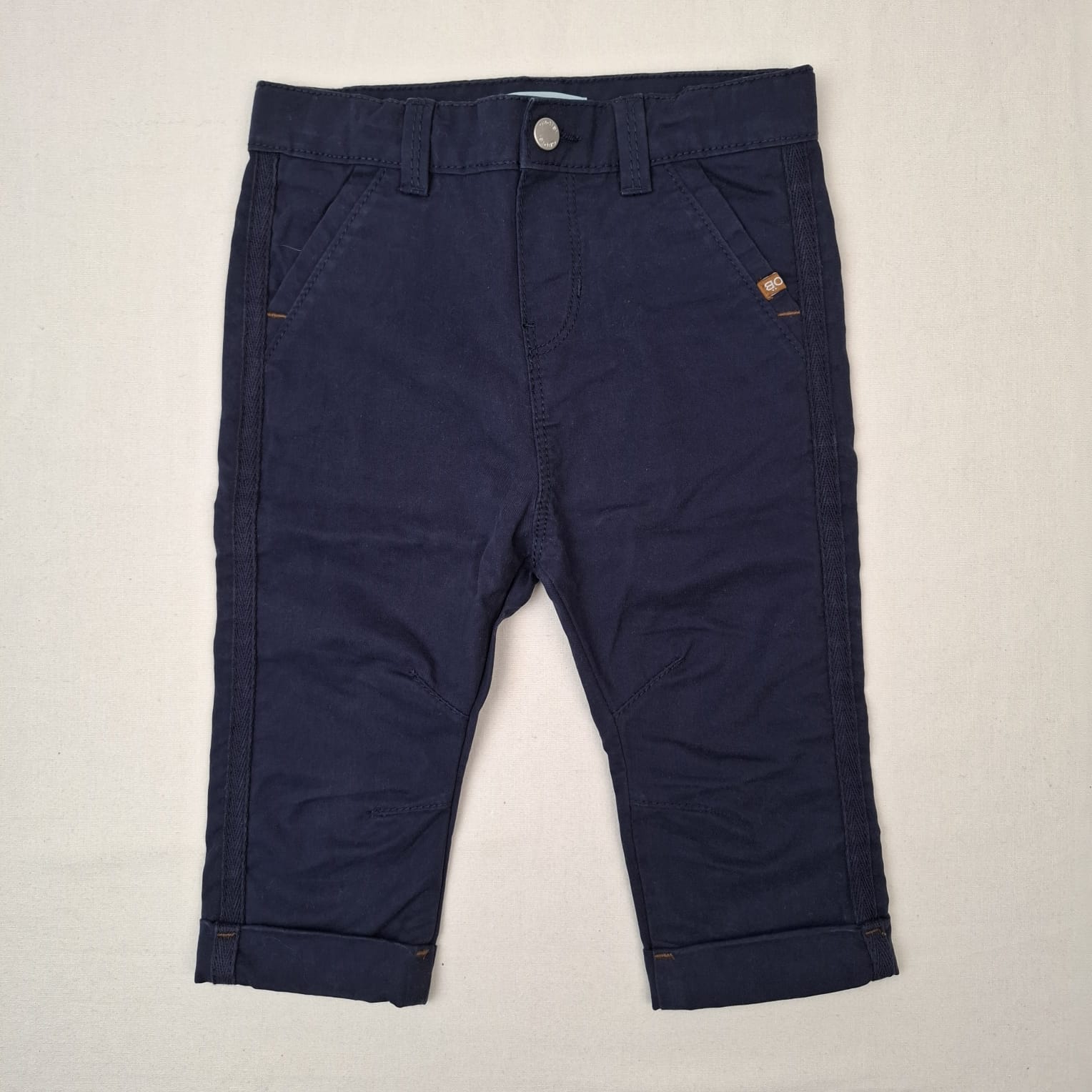 Autres commentaires : Pantalon bleu marine, ceinture ajustable par élastique intérieur, fermeture par bouton pression, revers en bas de jambe.