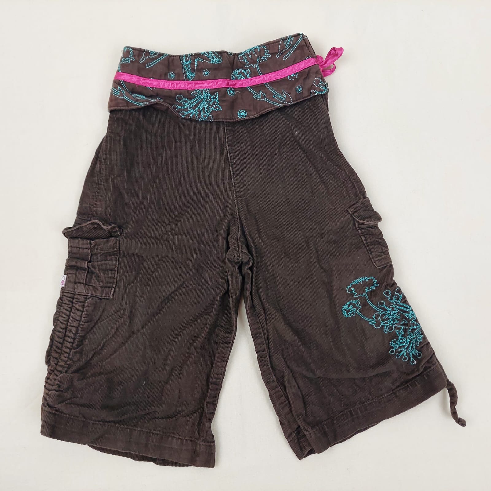 Autres commentaires : Pantalon cargo marron, brodé, ceinture en cordon satiné, fermeture zip à gauche, poches cotés