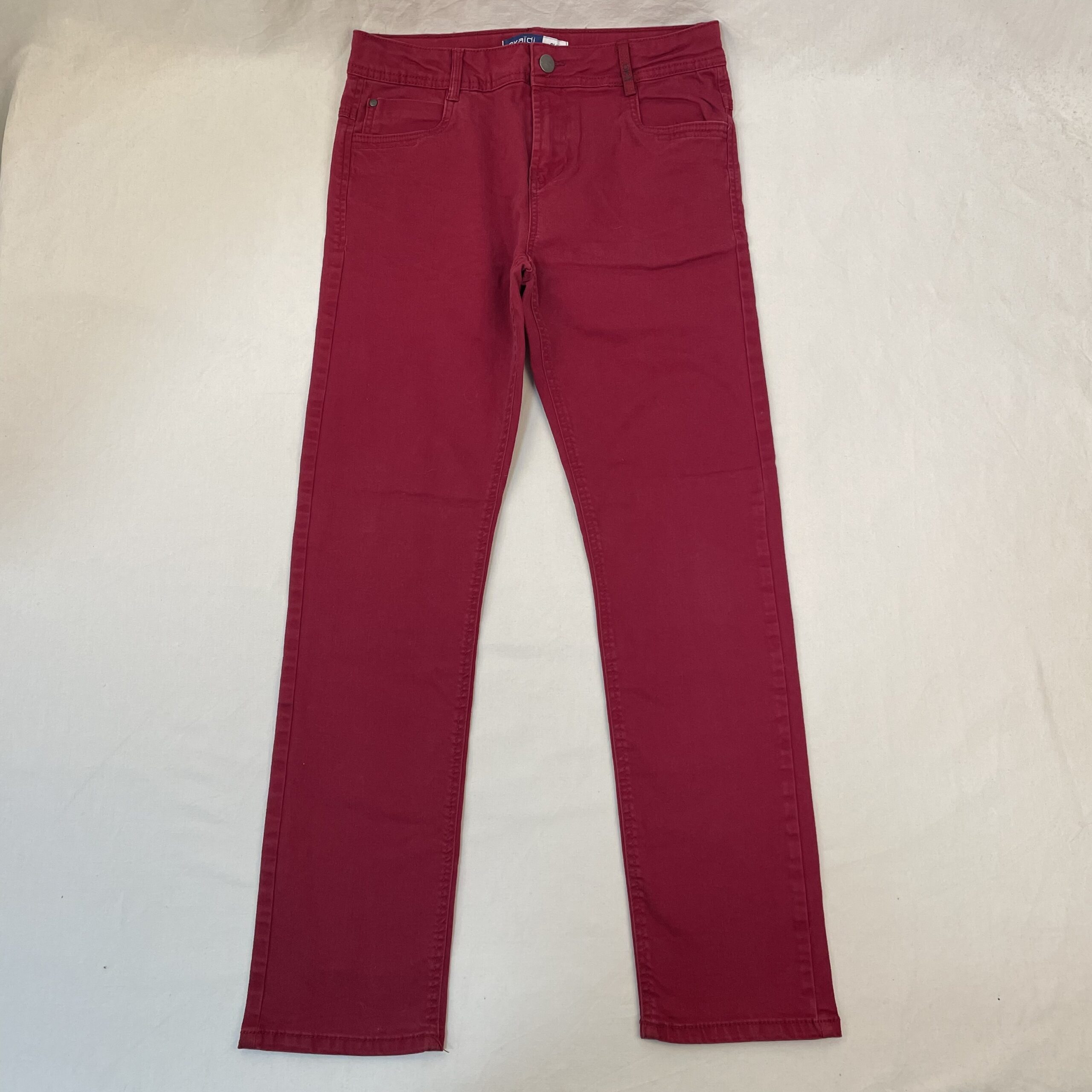 • Pantalon en toile rouge bordeaux, slim, fermeture par zip et bouton classique, ceinture ajustable par élastique intérieur