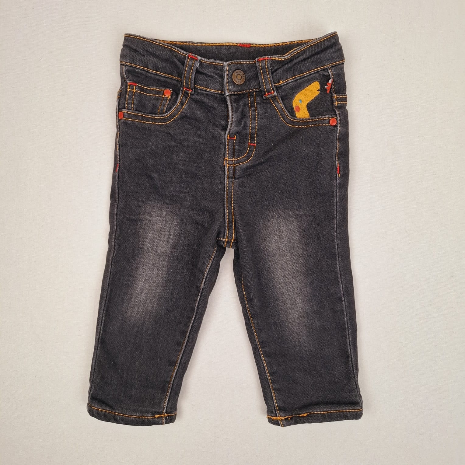 Autres commentaires : Pantalon gris, avec finitions en orange, doublé, taille élastiqué, élastique pour régler la taille, « Hello » brodé sur la poche arrière gauche, et illustration sur la poche gauche.