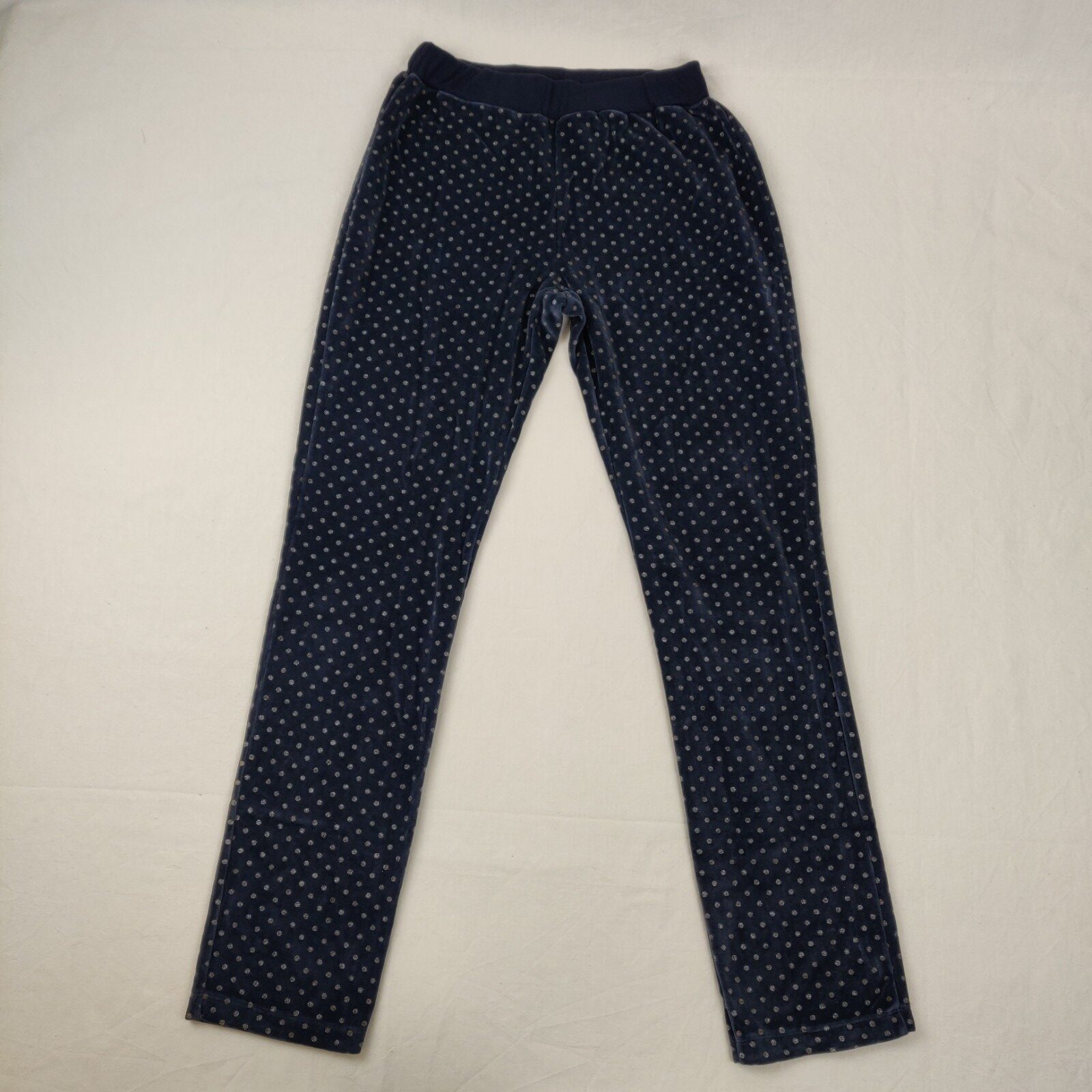 Autres commentaires : 25% polyester. Pantalon de pyjama bleu foncé avec des points dorés et taille élastiquée.
