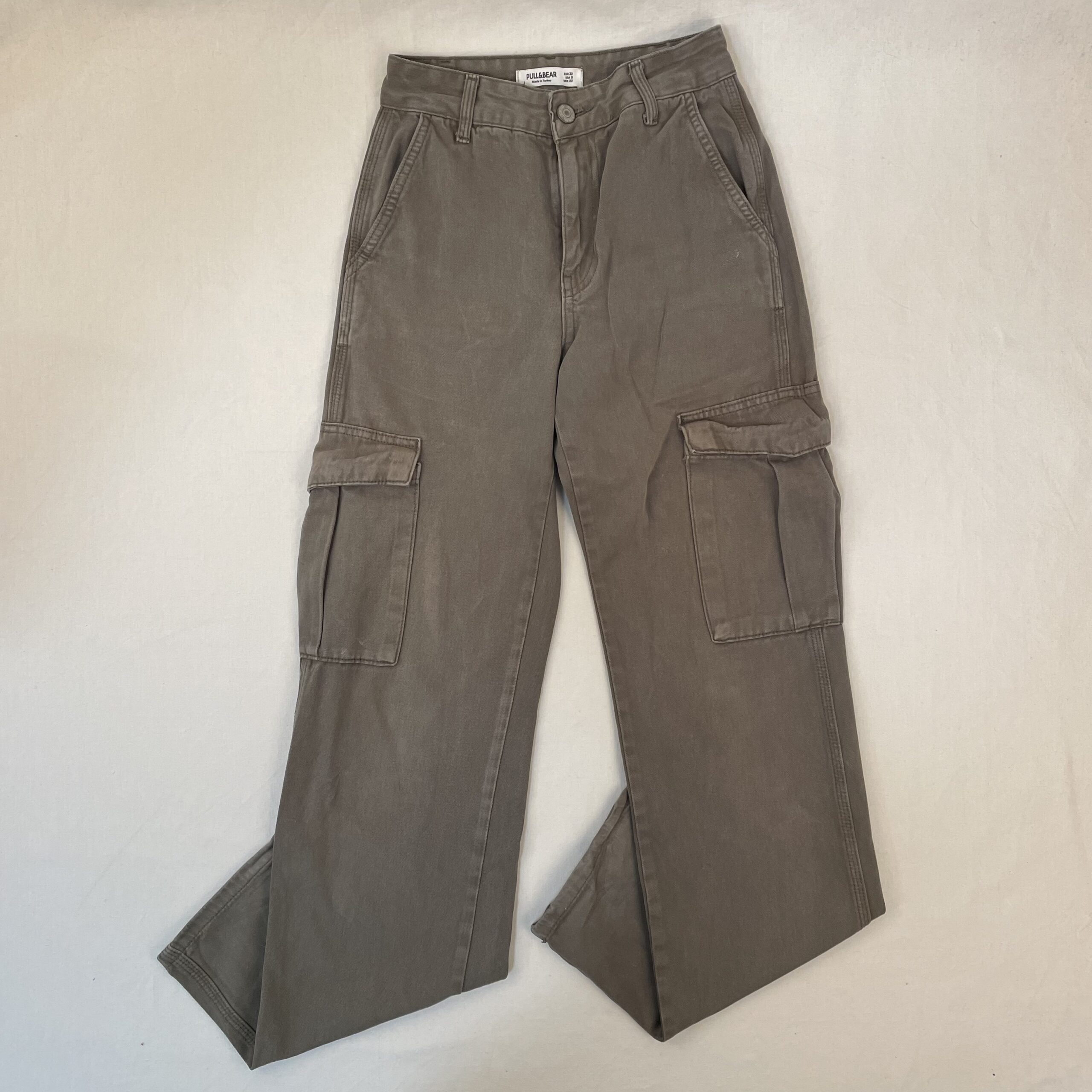 - Pantalon style cargo, vert kaki, fermeture devant par zip et bouton classique, taille étroite. Taille 32 (XS).