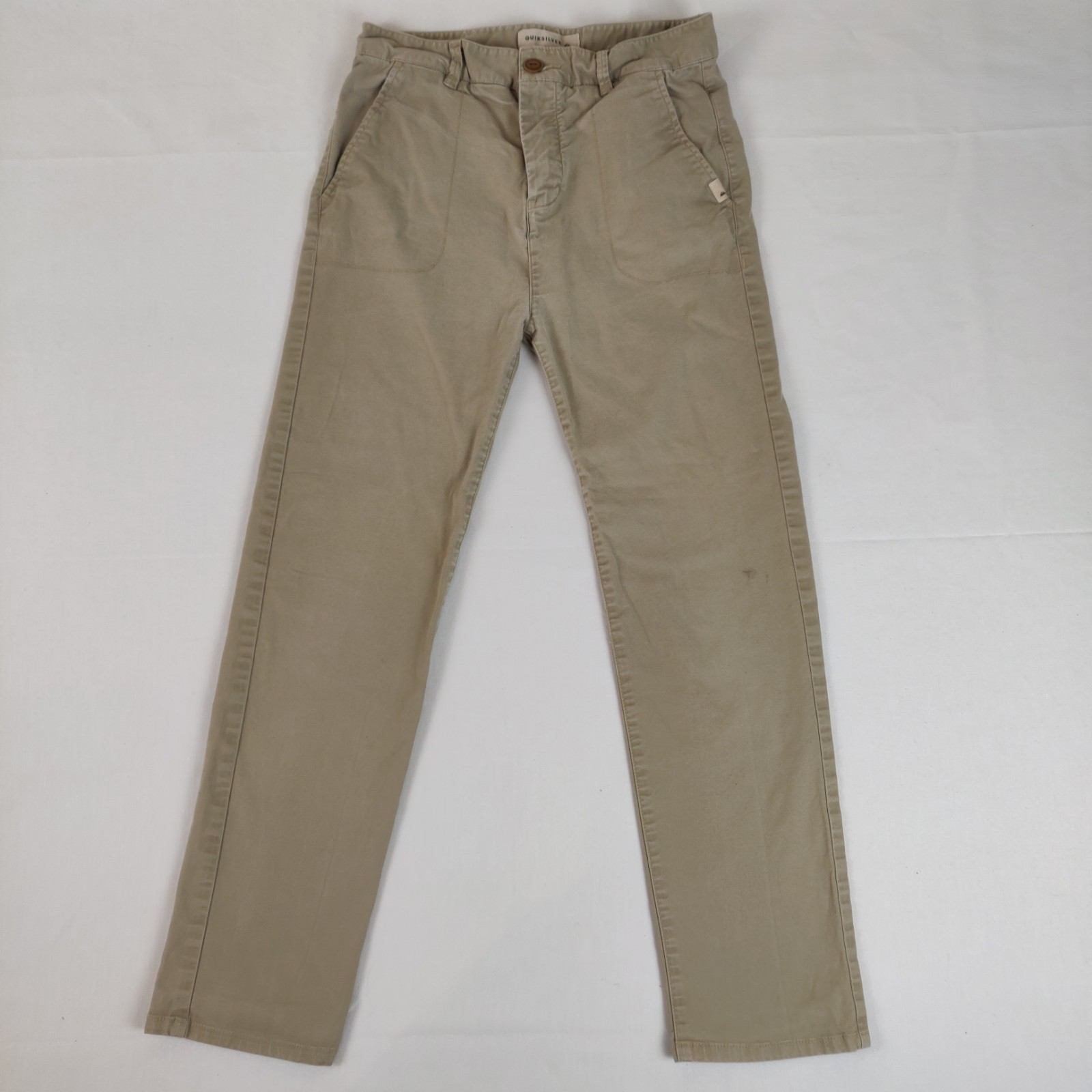 Autres commentaires : 10% polyester, 3% élasthanne. Pantalon type chino – marron. 2 poches latérales et 2 poches arrières. Griffe de la marque cousue au dessus de la poche arrière droite. Petites tâches grises au niveau du genou avant gauche. Niveau réduit de kiwi à fraise.