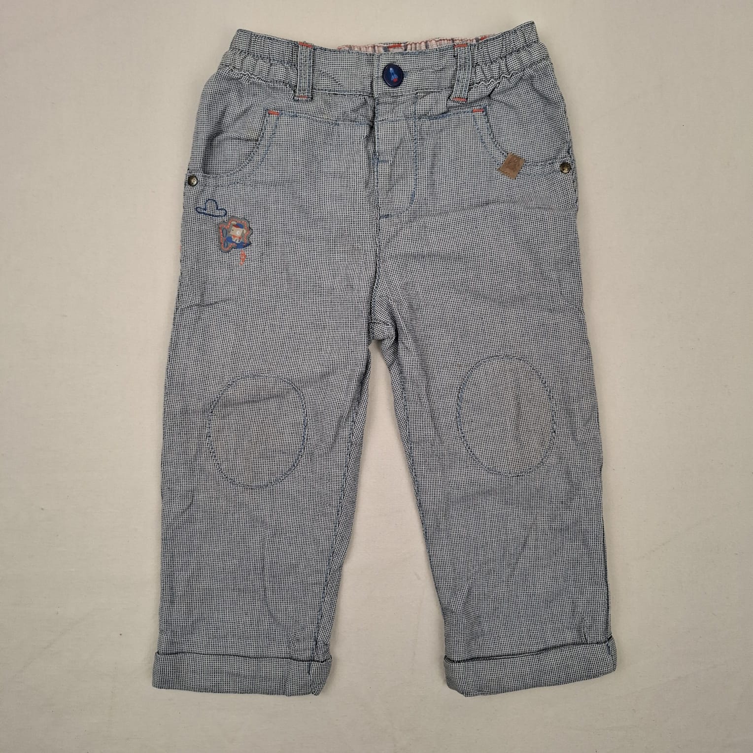 Autres commentaires : Pantalon à minuscules carrés bleus et blancs, doublé de coton bleu marine, fermeture devant par bouton pression, taille élastiquée, revers aux chevilles, genouillères ton sur ton, devant motifs cousus de nuage et de mini pilote d’avion à hélices bleus et orange.