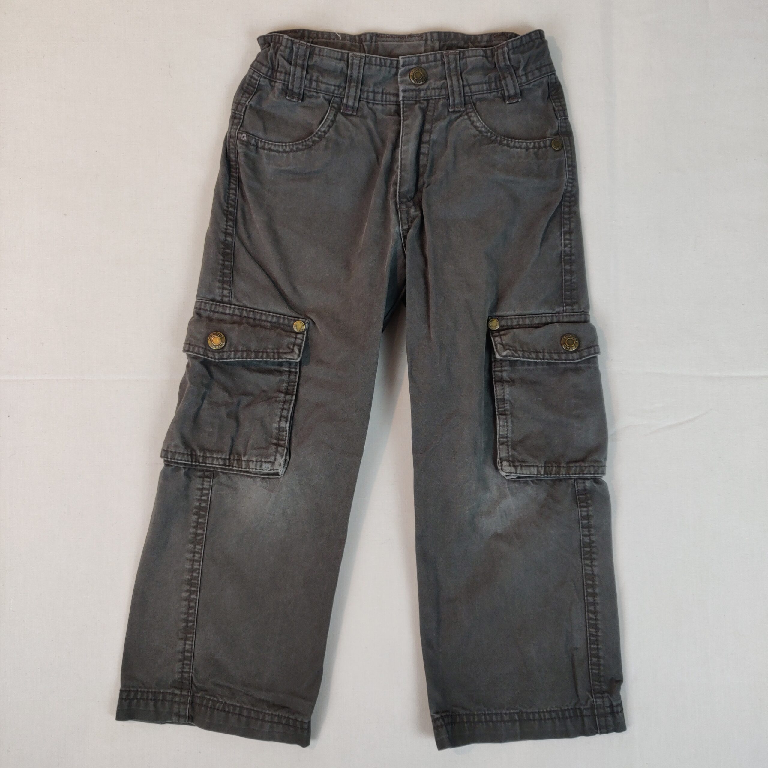 Autres commentaires : Pantalon avec taille ajustable – marron glaçé. Petite ouverture centrale à fermeture éclair métallique se terminant par un bouton pression. 2 poches classiques sous la taille. 2 poches au niveau des genoux se fermant avec un bouton pression. 2 poches à l’arrière avec bouton pression. Passants pour une ceinture. Légères traces d’usure au niveau des genoux.