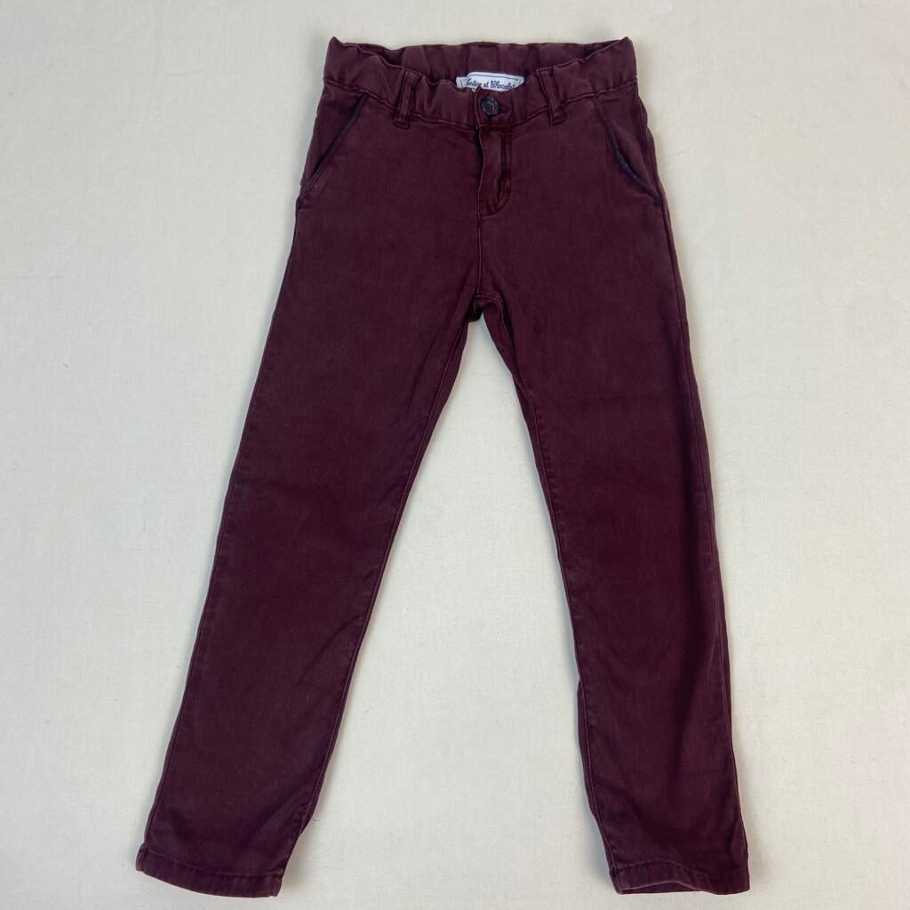 Autres commentaires : Pantalon bordeaux slim, fermeture par bouton et zip, ceinture ajustable par élastique intérieur.