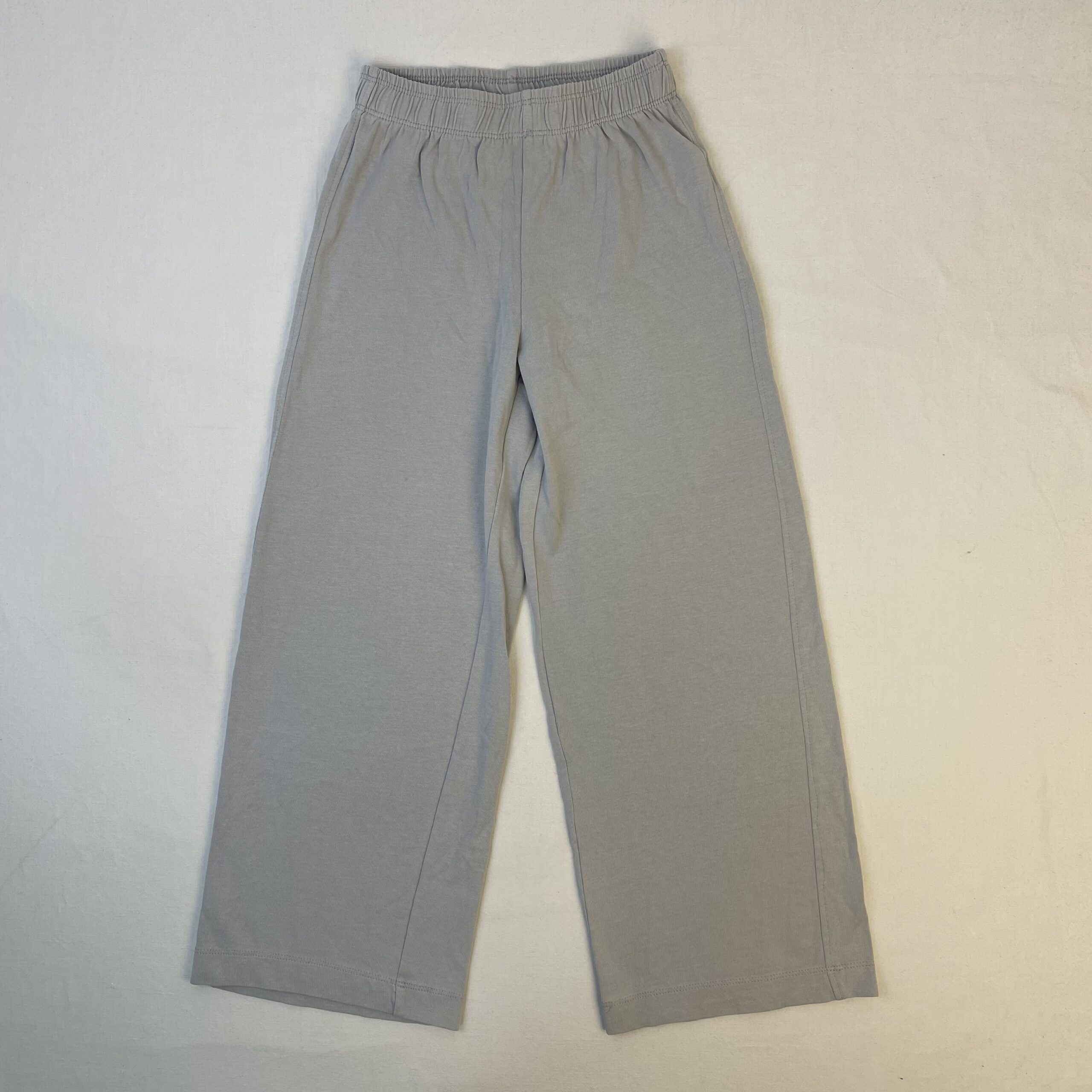 - Pantalon fluide et large, gris très clair, taille élastiquée.