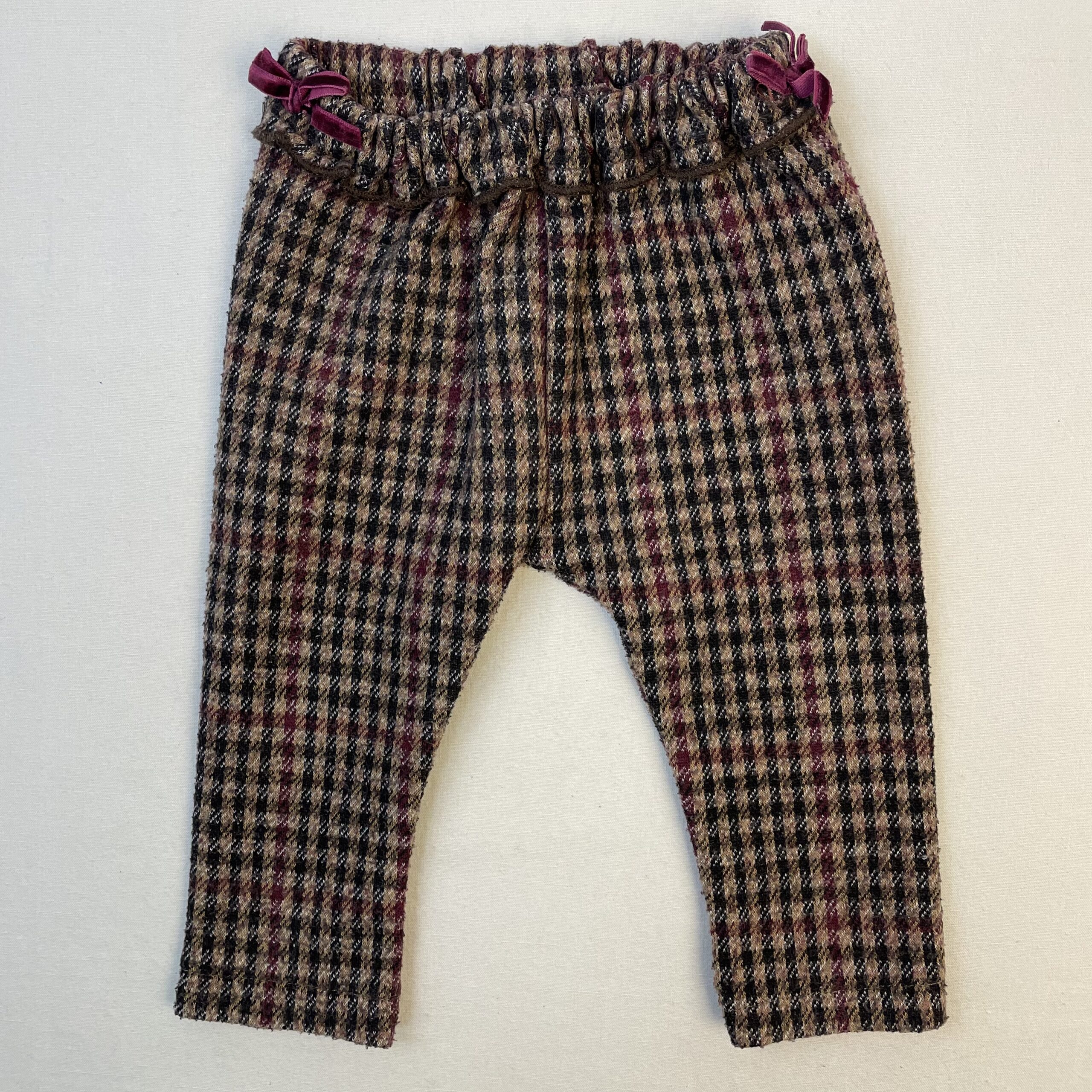 - Pantalon épais marron clair à carreaux bleu nuit et bordeaux, taille élastiquée avec bordure marron, petit nœud en velours bordeaux de chaque côté. 6-9M (12M taille française)