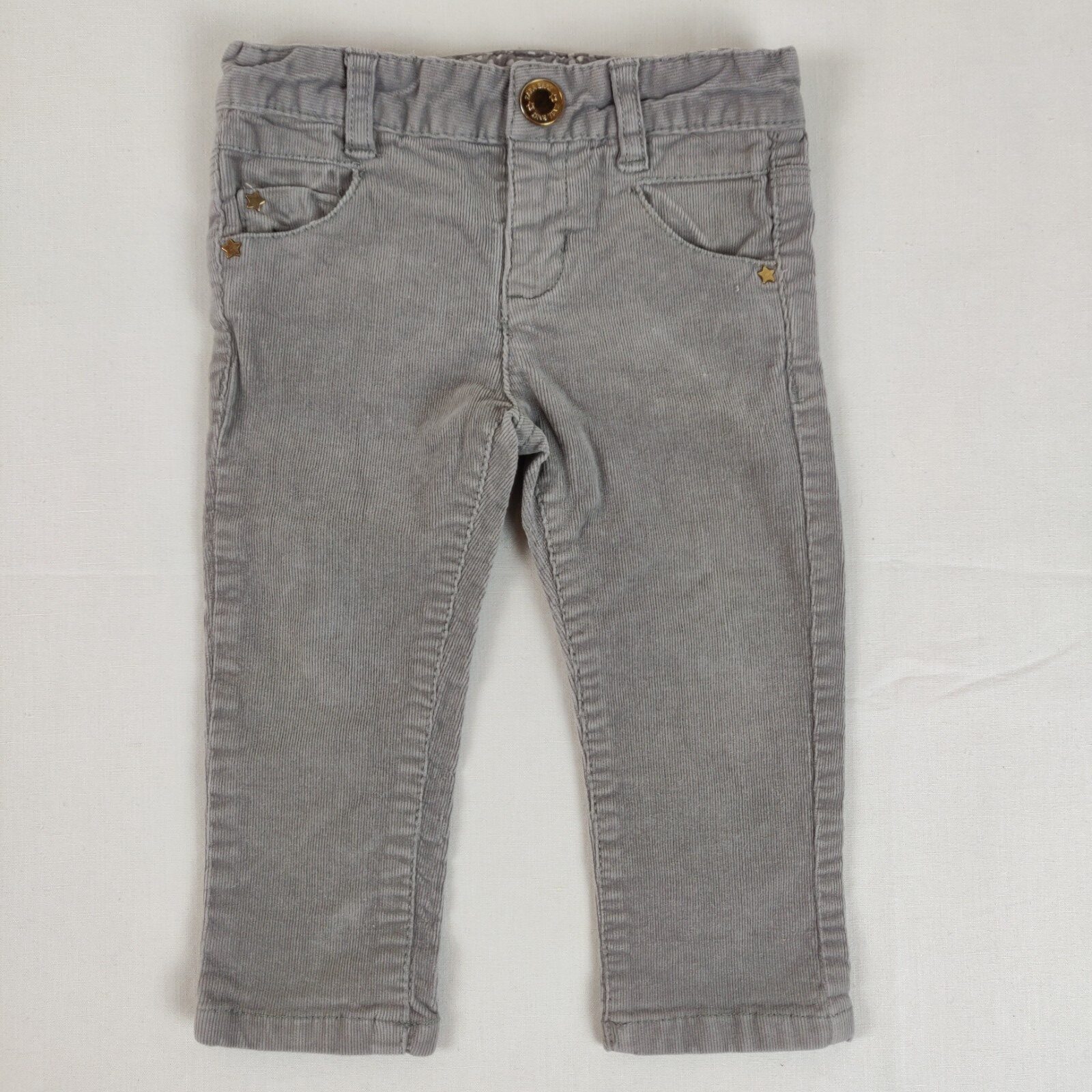 Autres commentaires : 2% élasthanne. Pantalon en velours finement côtelé – gris taupe. Taille ajustable. 2 poches latérales et 2 poches arrières décorées d’étoiles dorées.