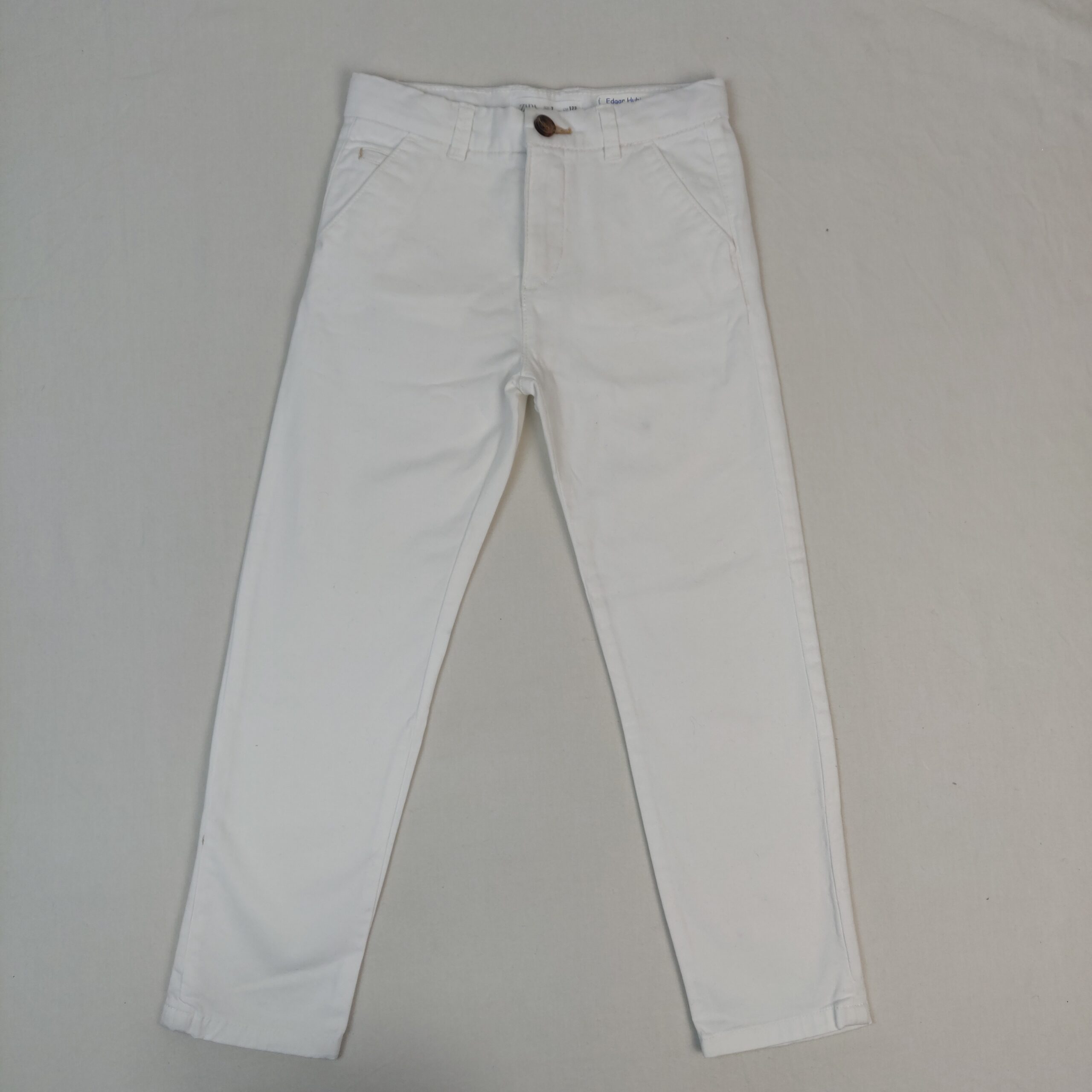 Autres commentaires : Pantalon blanc skinny fit, ceinture ajustable par élastique intérieur, fermeture par boutons et zip. Bon état avec une minsucule tache latérale à peine visible.