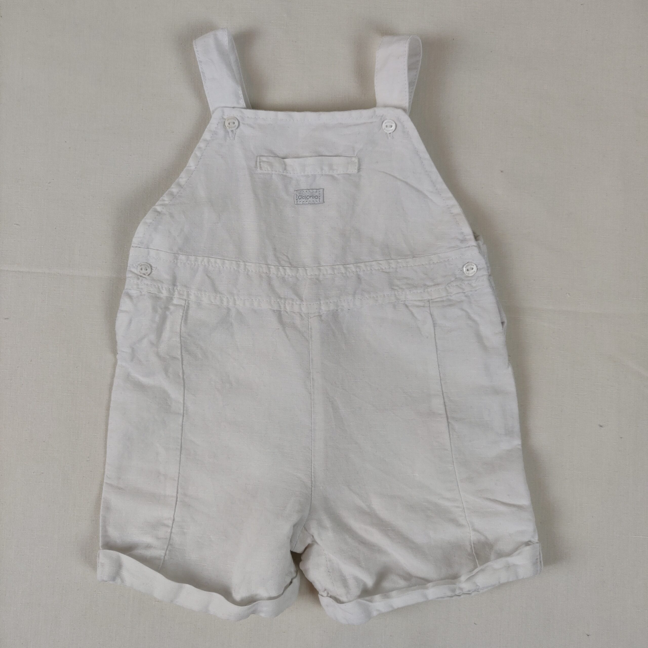 Autres commentaires : 7% élasthanne. Salopette courte blanche, fermeture par boutonnière aux bretelles et à la taille, et boutons pression à l’entrejambe.