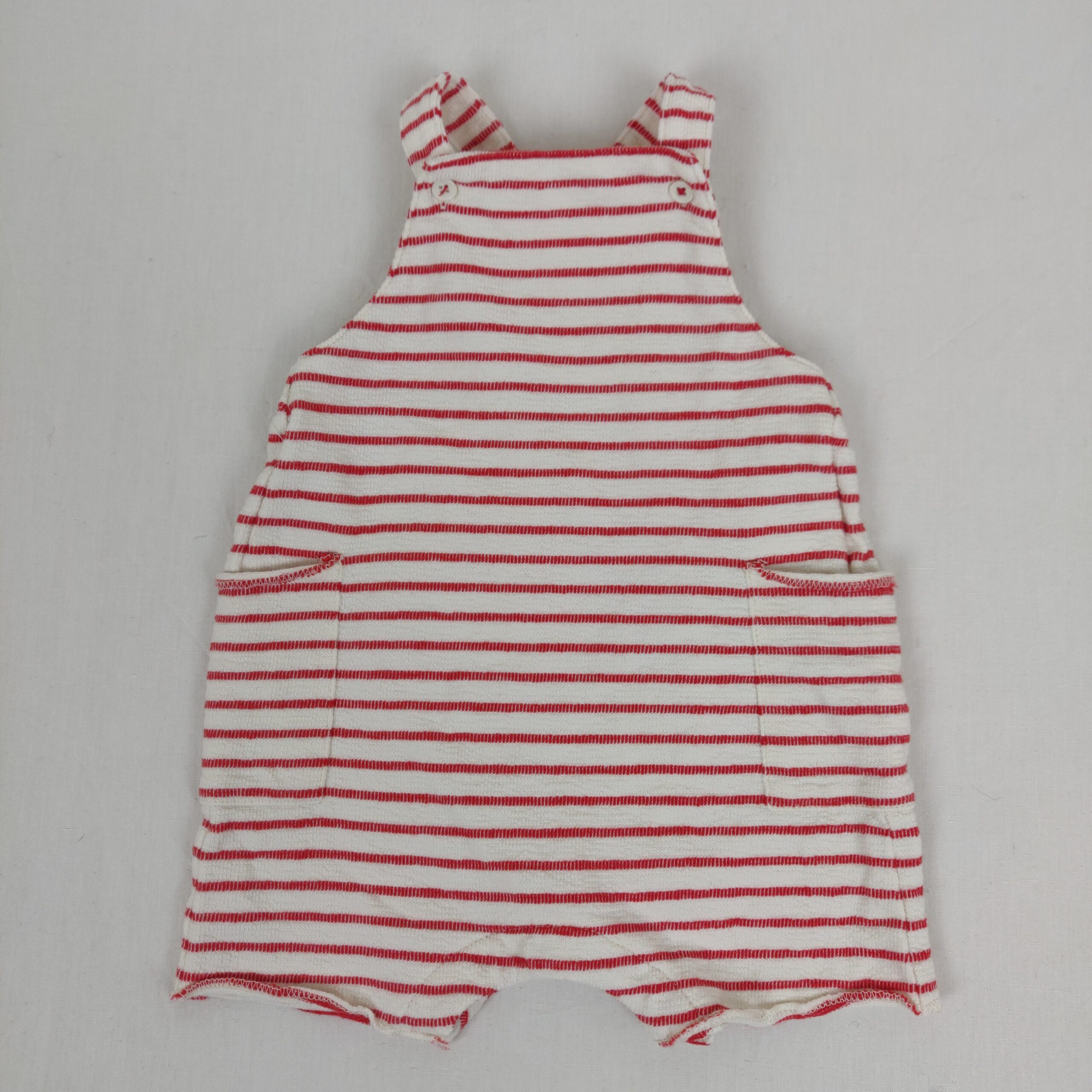 Autres commentaires : Salopette blanche courte avec des rayures rouges, dos croisé et 2 poches latérales.