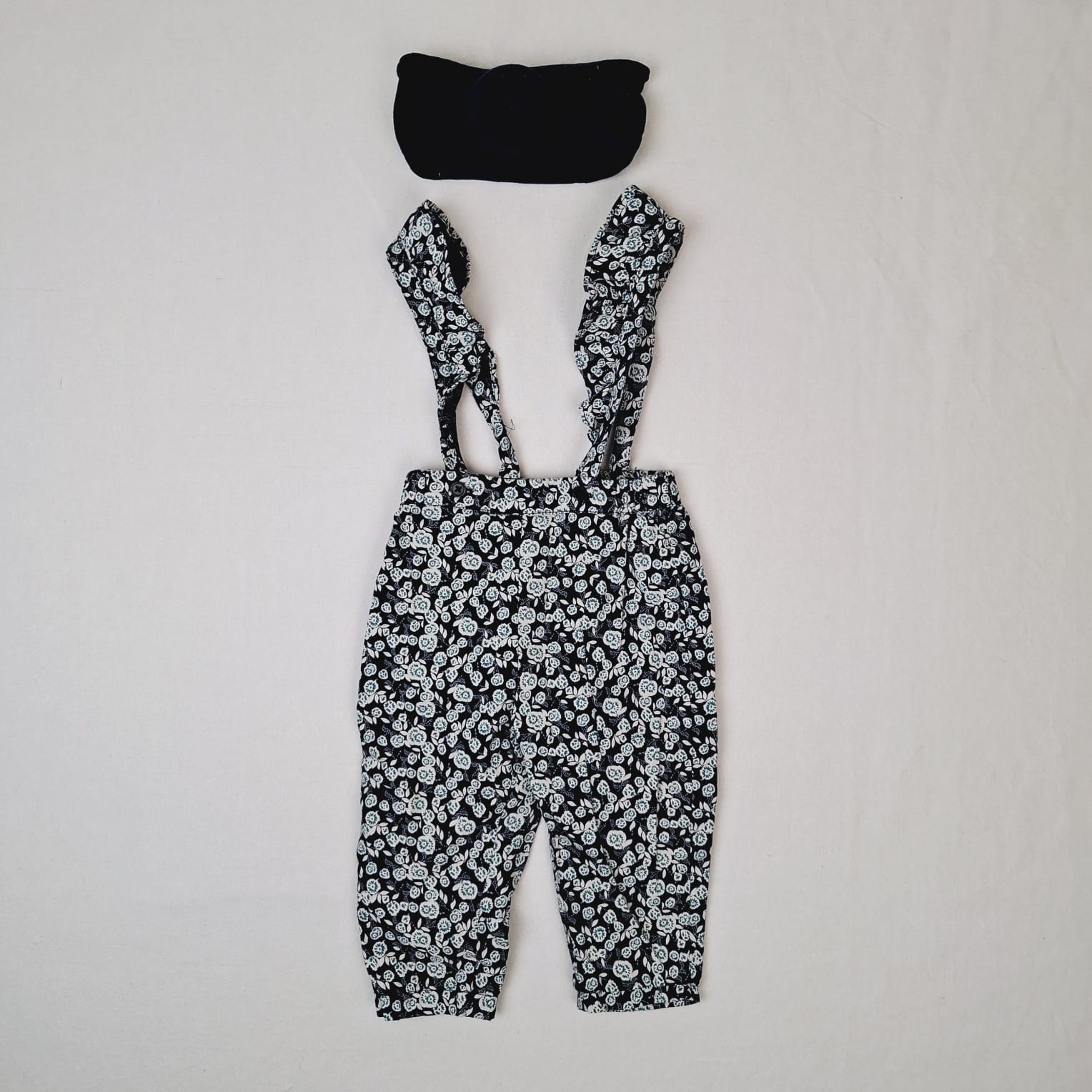 Autres commentaires : Salopette marine, motif floral, taille élastique, bretelles volantées, hauteur des bretelles réglable par deux boutons, doublure en coton. Bandeau marine.
