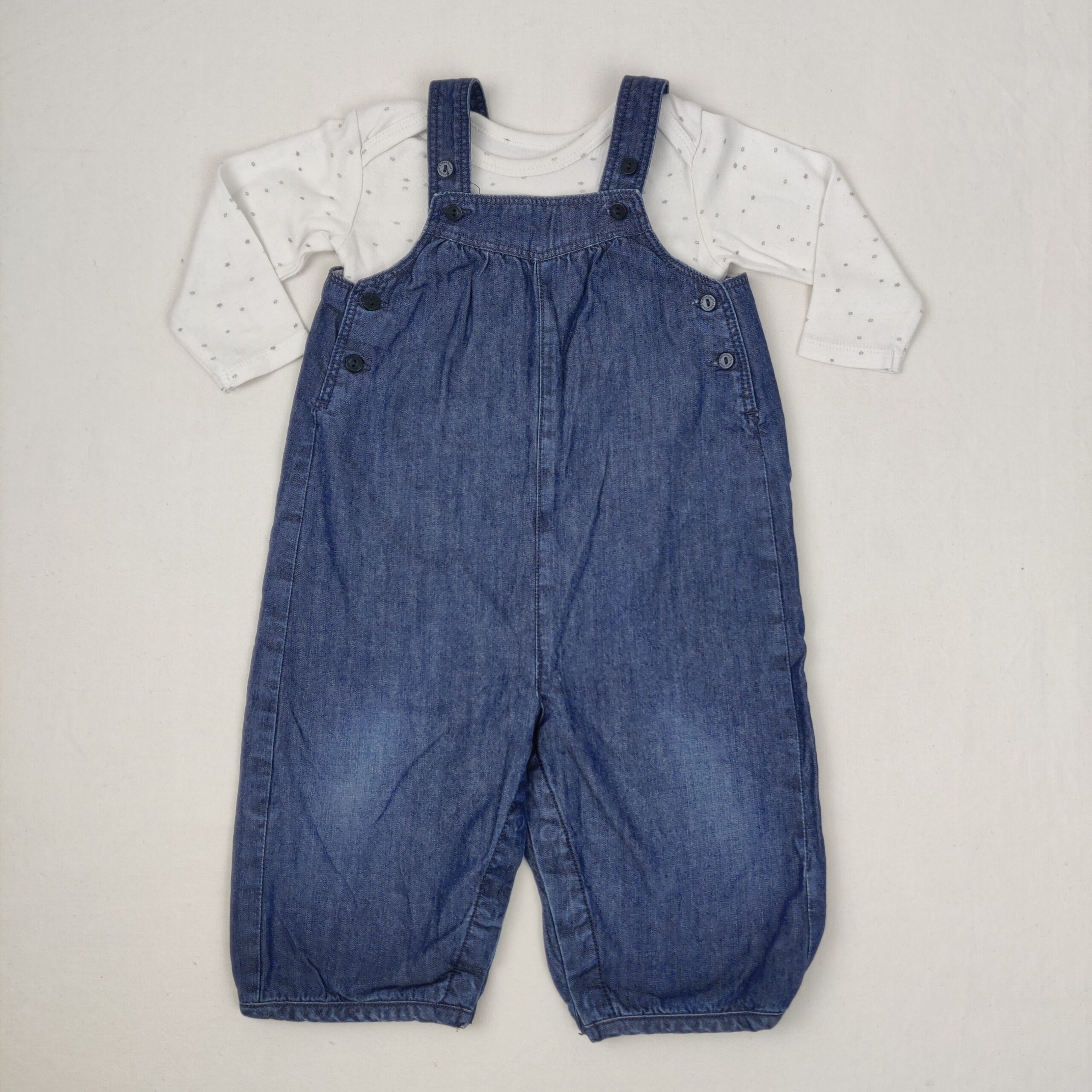 Autres commentaires : Salopette bleu style denim Bout’chou doublée jersey, des bretelles réglable par deux boutons, fermetures latérales et à l’entrejambe par boutons pression; Body à manches longues KIABI offert