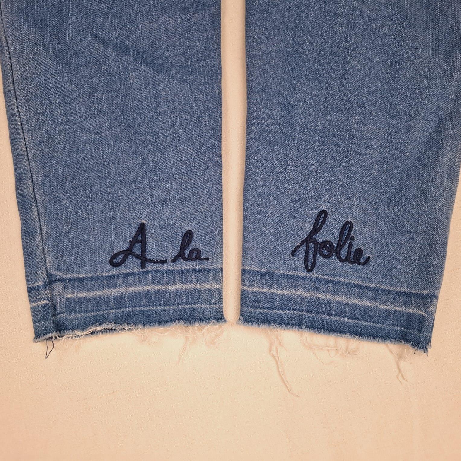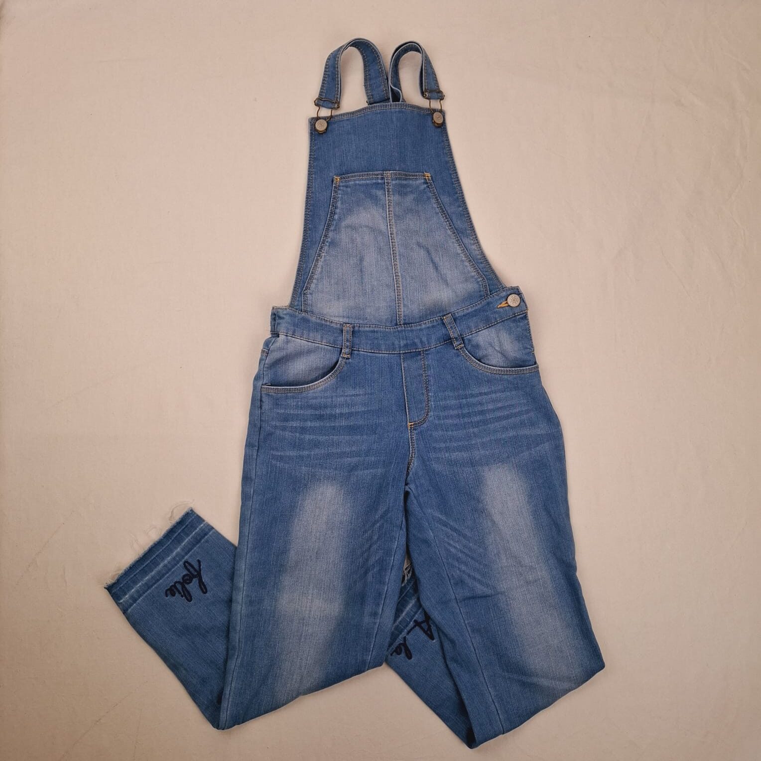 Autres commentaires : Salopette longue en jean, à bretelles croisées et ajustables par coulissement, fermeture par clip métallique en haut et latérale par boutons, inscriptions bleu foncé « A la » en bas de la jambe arrière droite et « folie » en bas de la gauche, effet effiloché au niveau de la couture.