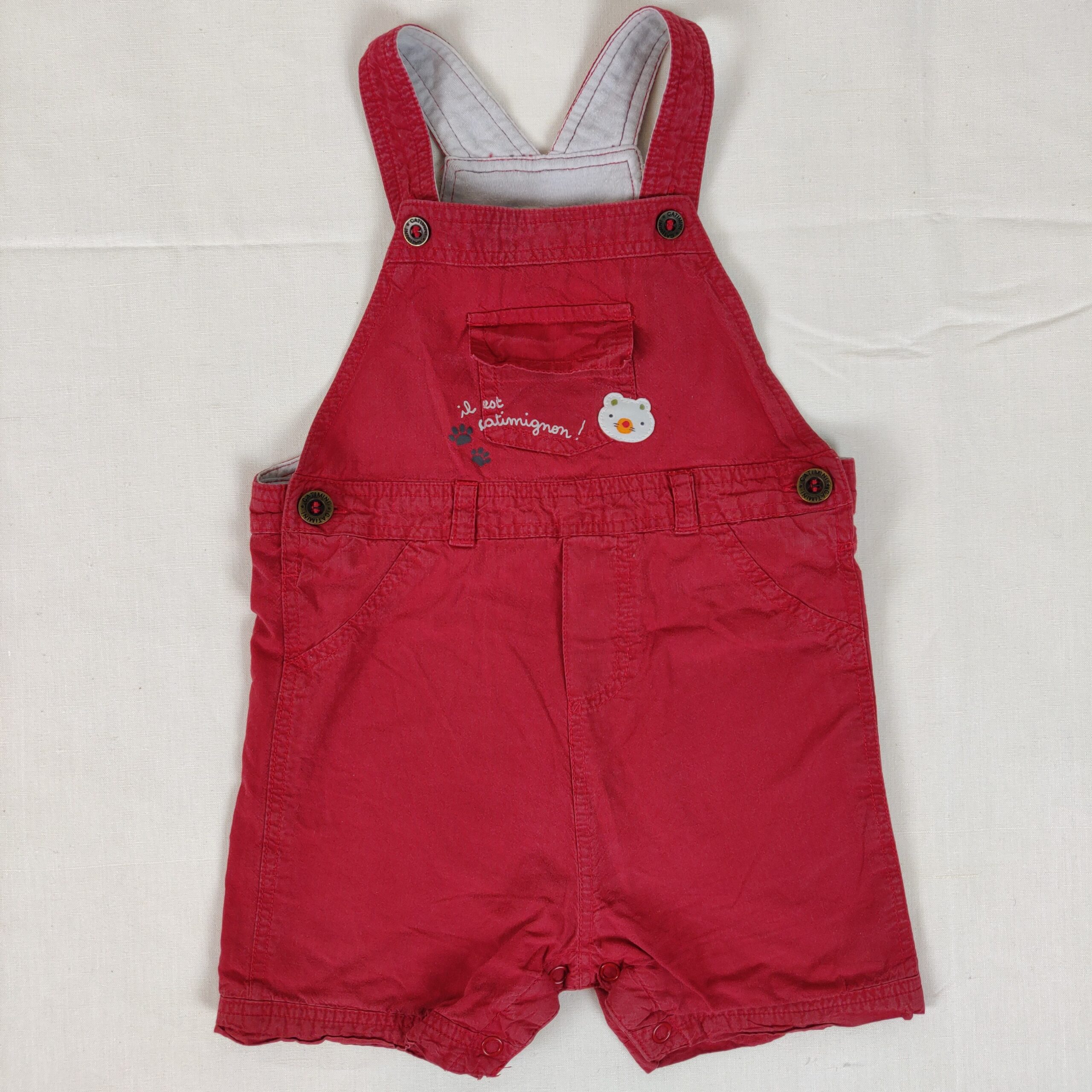 Autres commentaires : Salopette courte légère rouge à très fines rayures grises, doublure jersey gris, une poche centrale sur le torse, avec une tête d’ours et ses empreintes. Inscription « il est trop catimignon ! ». Fermeture par boutons deux niveaux aux bretelles, boutons sur les côtés, et boutons pression à l’entrejambe. Impeccable