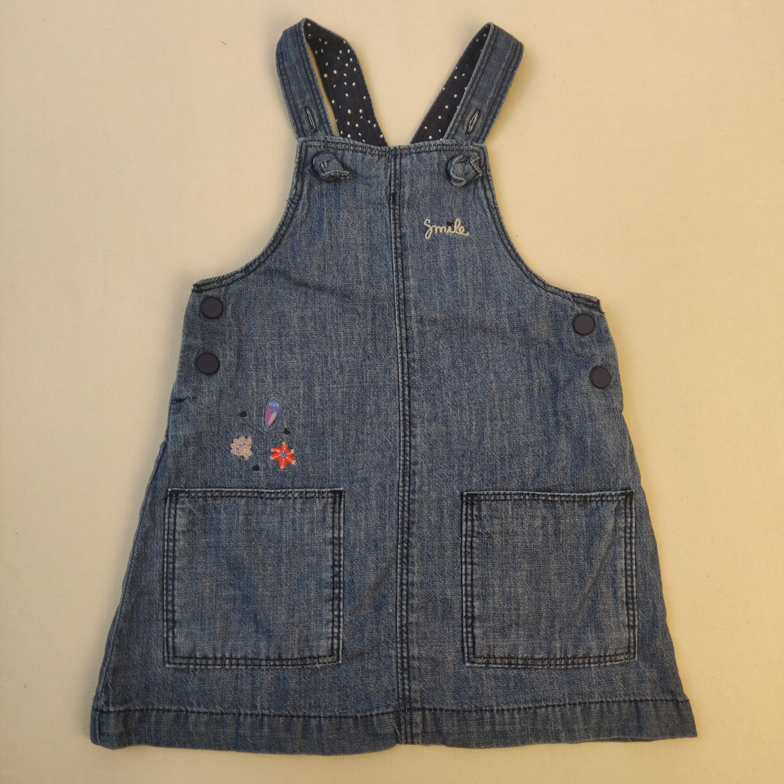- Salopette bleu jean, motifs floraux, bretelles attachables par boutons.