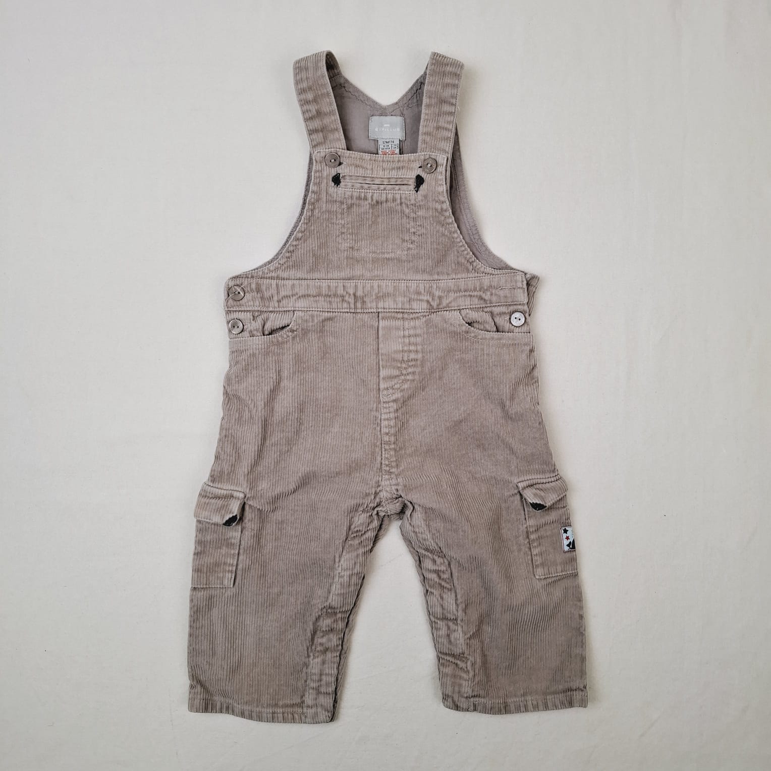 Autres commentaires : Salopette longue en velours beige taupe, doublure au niveau du haut en jersey100% coton beige uni, hauteur des bretelles réglable par deux boutons, fermetures latérales par boutons et à l’entrejambe par boutons pression.