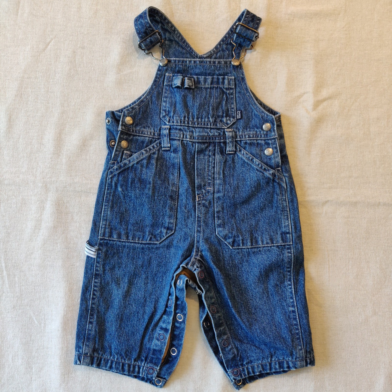 Autres commentaires : Salopette en denim, doublure toile de coton couleur camel, deux grandes poches plaquées à l’avant et deux au dos. Fermeture par crochet, hauteur ajustable, deux boutons pression sur chaque côté et boutons pression à l’entrejambe.
