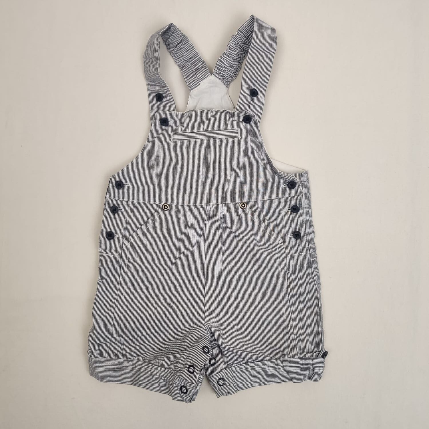 Autres commentaires : Salopette courte à fines rayures blanches et bleu foncé, fermetures latérales par petits boutons et par boutons pression à l’entrejambe, bretelles elastiquées et réglables par deux boutons.