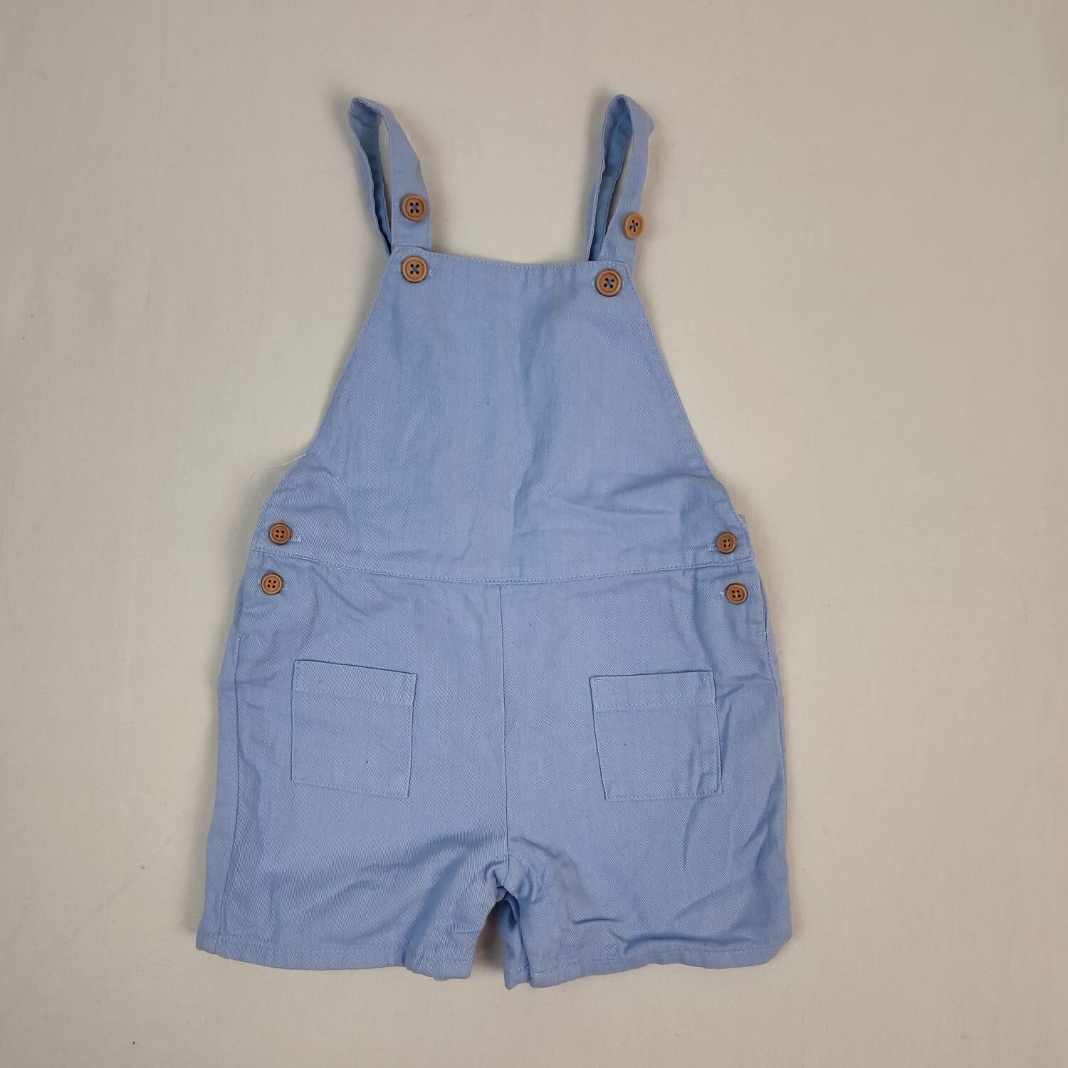 Autres commentaires : Salopette bleu clair, doublure en 100% coton, hauteur des bretelles réglable par deux boutons, fermetures latérales par petits boutons et à l’entrejambe par boutons pression.