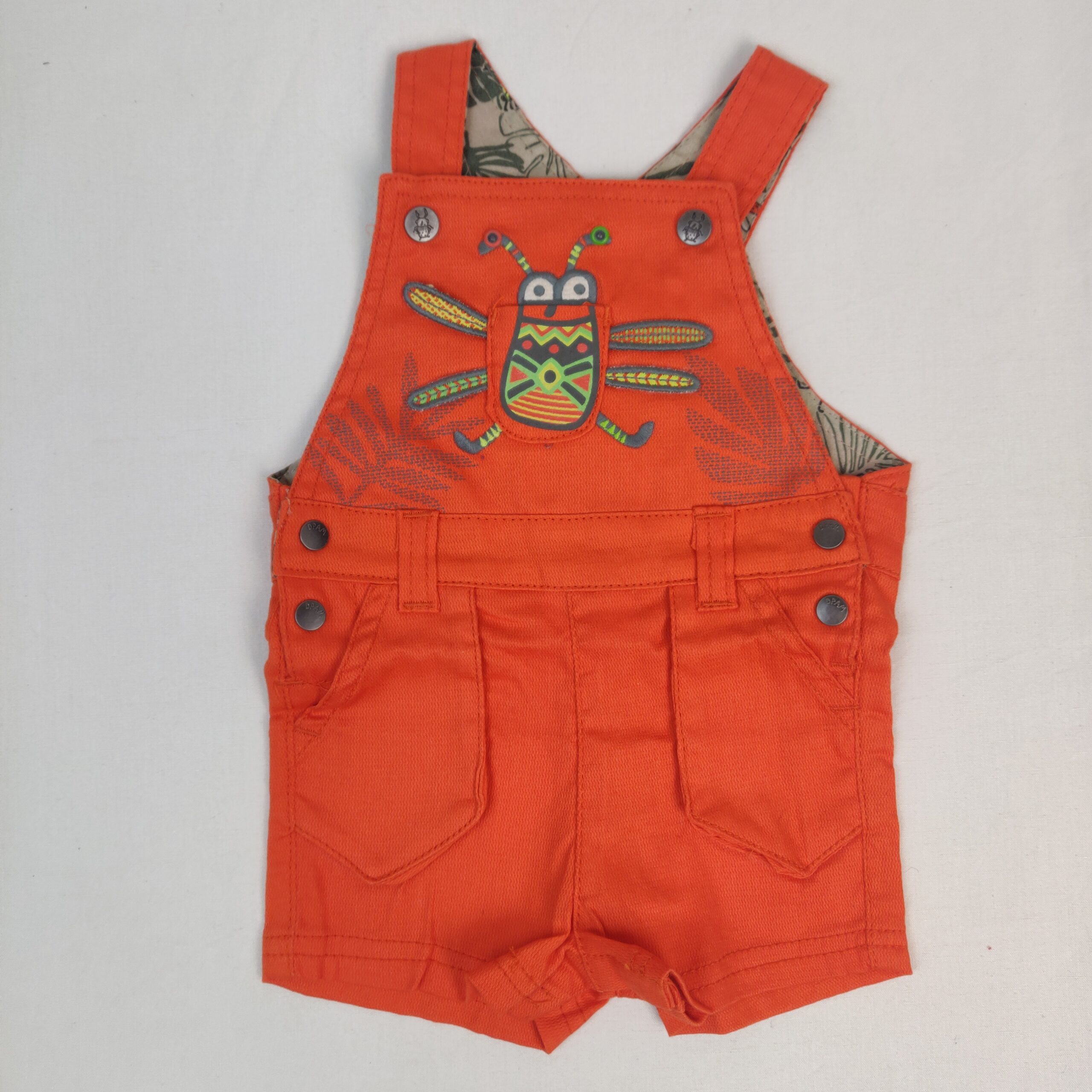 Autres commentaires : 1% élasthanne – Salopette courte orange motif insecte, doublure 100% coton beige avec feuillages kaki, bretelles à 2 boutons pression réglables, fermeture par boutons pression à l’entrejambe et latérales, petite poche sur les cotés