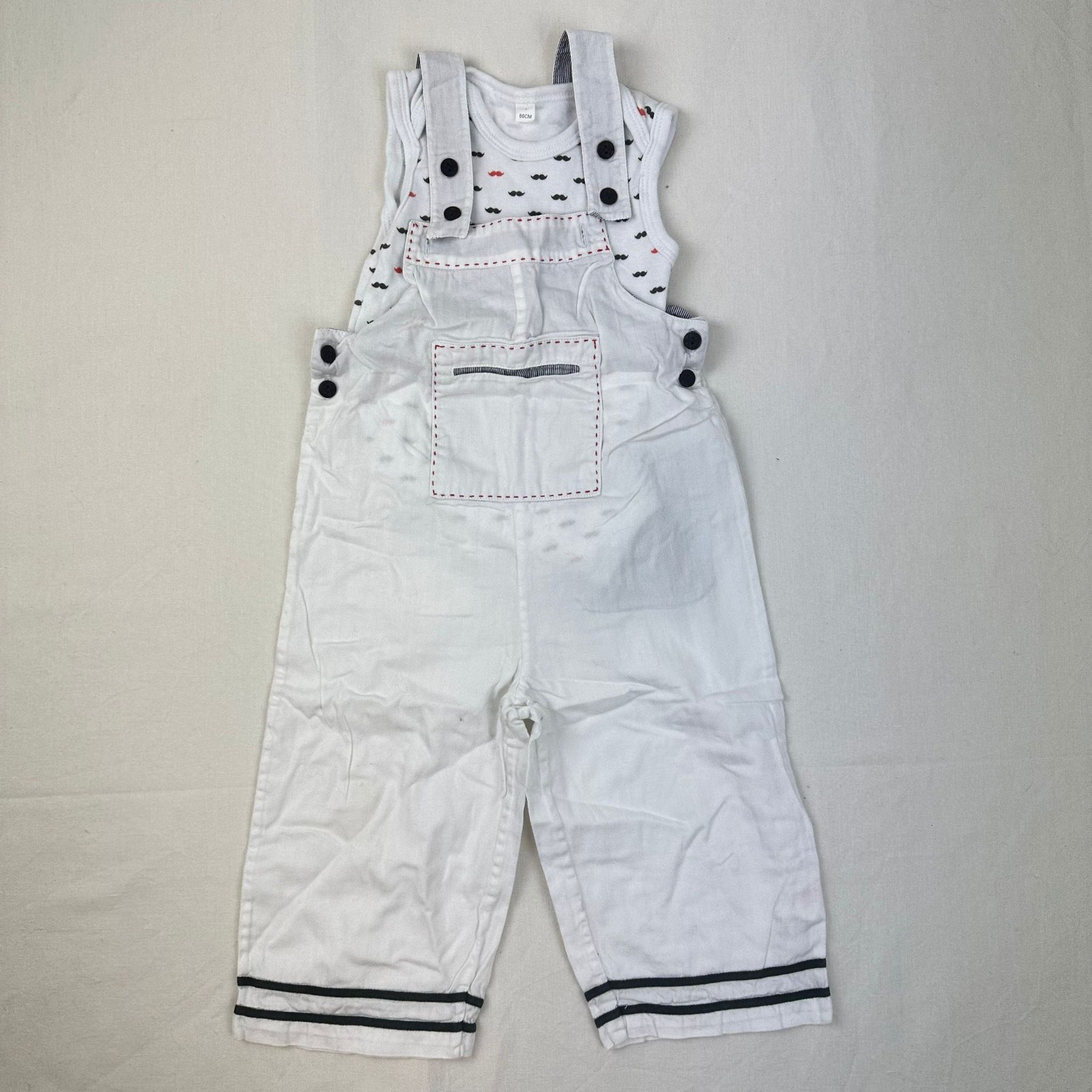 Autres commentaires : Salopette DPAM blanc avec bretelles ajustables et coutures noires et rouges. Body blanc Auchan sans manches avec de petites moustaches noires et rouges.