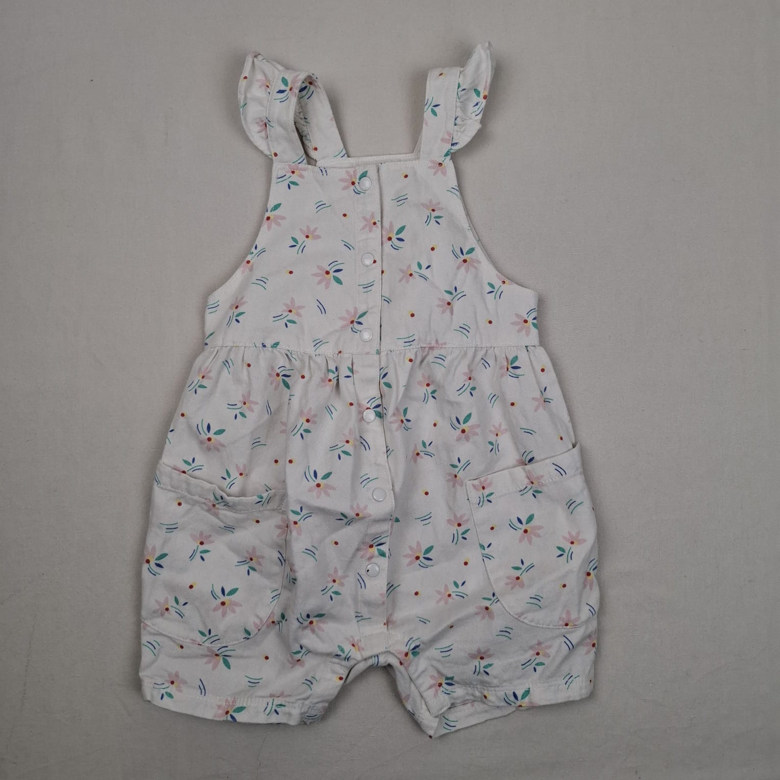 Autres commentaires : Salopette courte blanche en sergé de coton, deux poches, motif fleuri, bretelles volantées, fermeture par boutons pression devant et l’entrejambe.