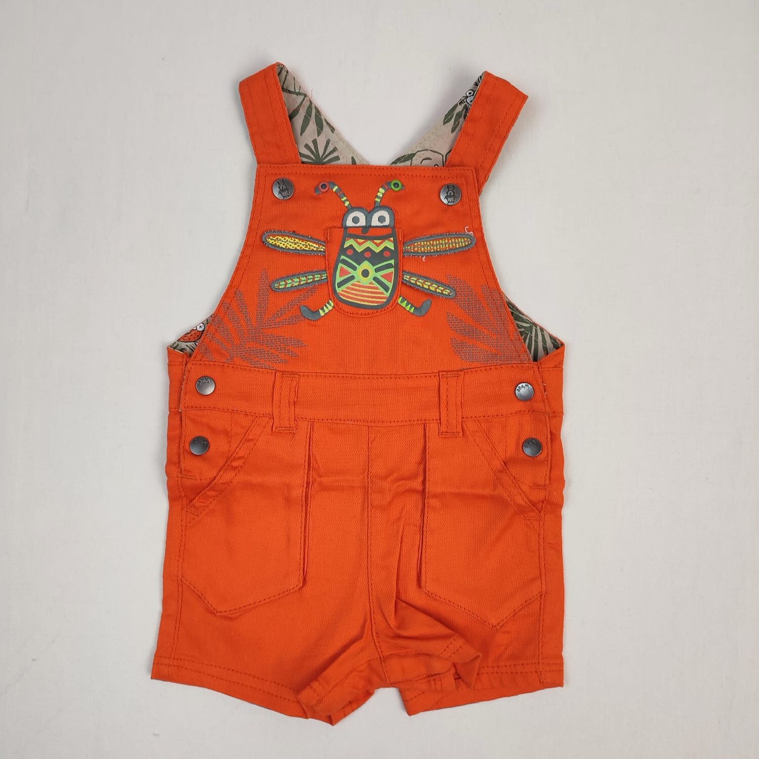 Autres commentaires : 1% élasthanne – Salopette courte orange motif insecte, doublure 100% coton beige avec feuillages kaki, bretelles à 2 boutons pression réglables, fermeture par boutons pression à l’entrejambe et latérales, petite poche sur les cotés