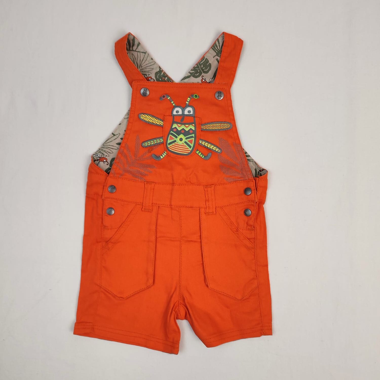 Autres commentaires : 1% élasthanne – Salopette courte orange motif insecte, doublure 100% coton beige avec feuillages kaki, bretelles à 2 boutons pression réglables, fermeture par boutons pression à l’entrejambe et latérales, petite poche sur les cotés